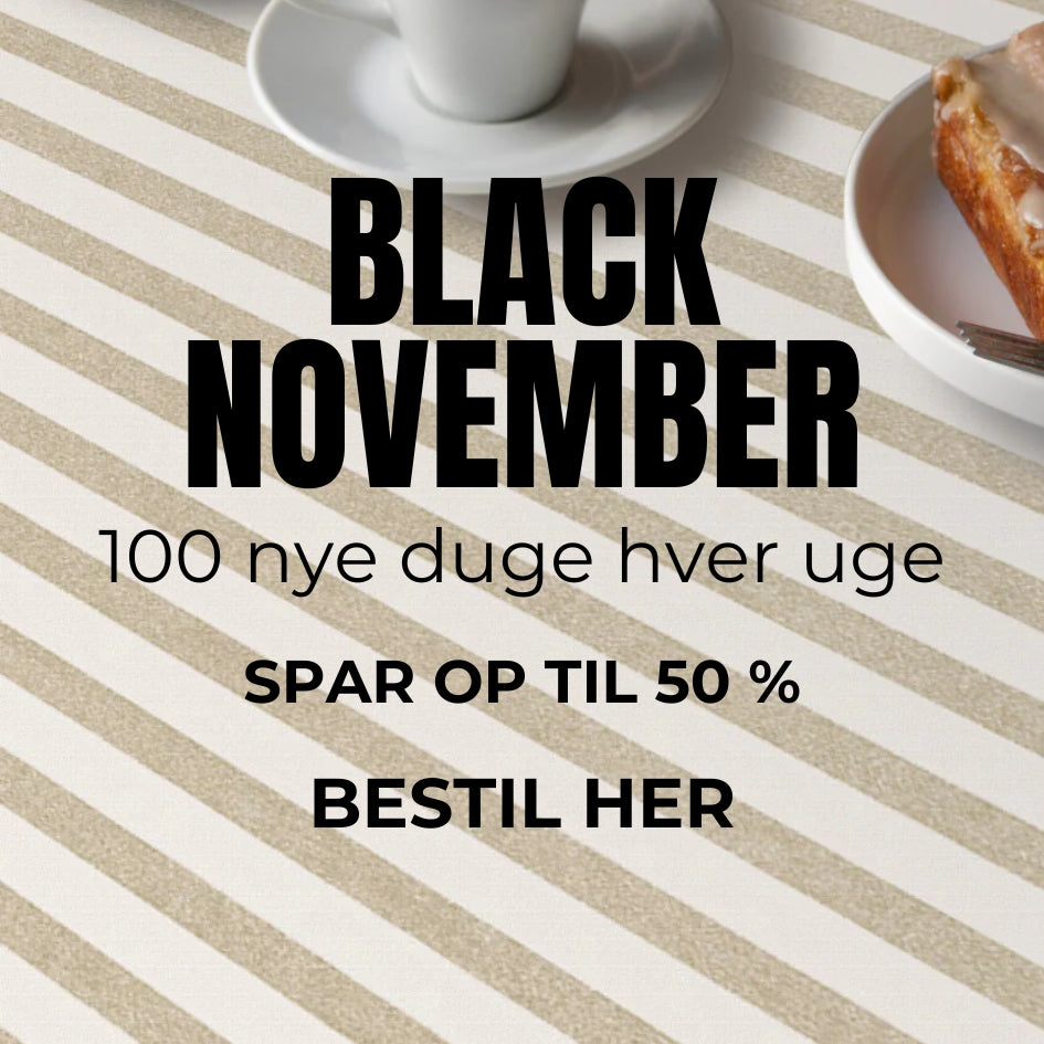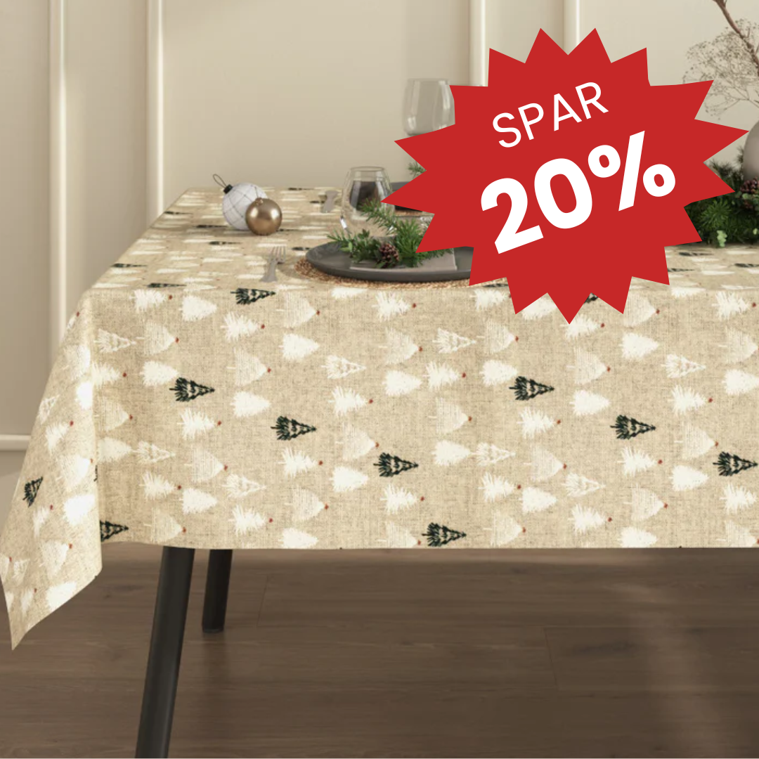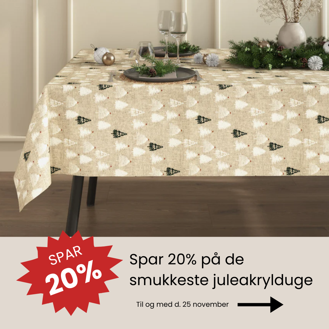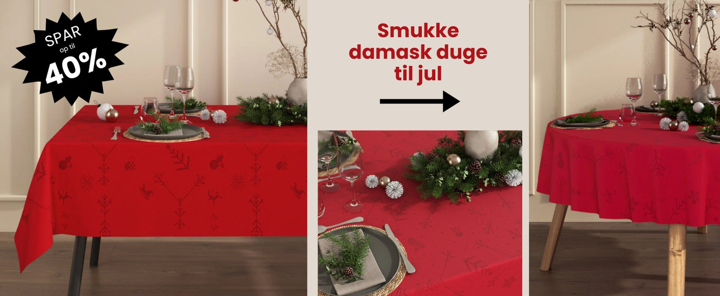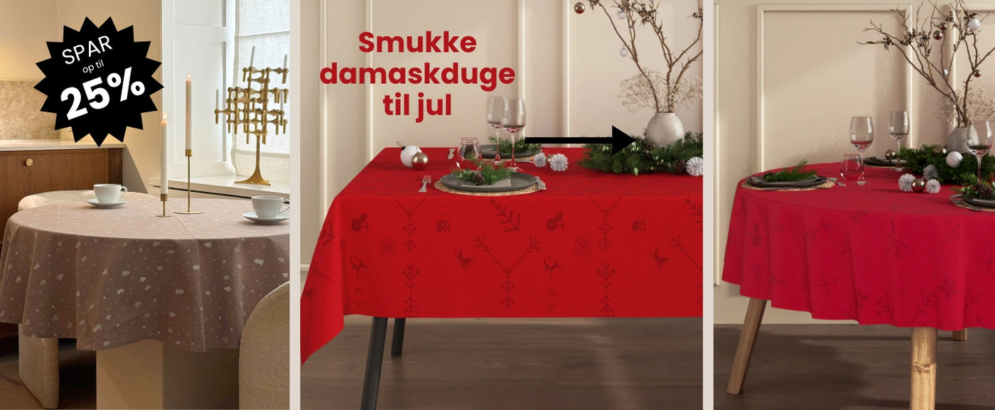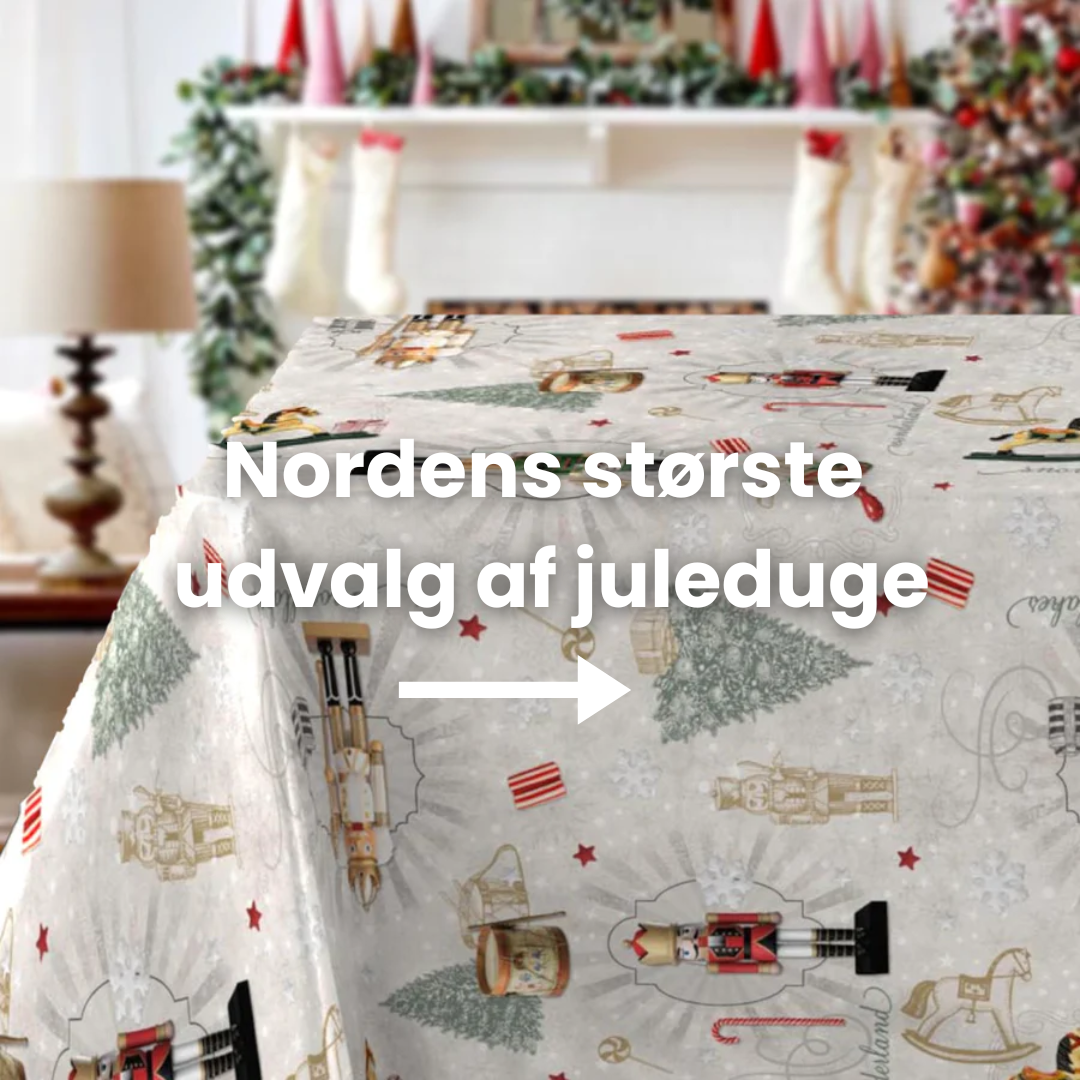 Du kan få næsten alle vores duge som runde, ovale eller med elastik. Gå ind på den ønskede dug for at se, om disse muligheder er tilgængelige.