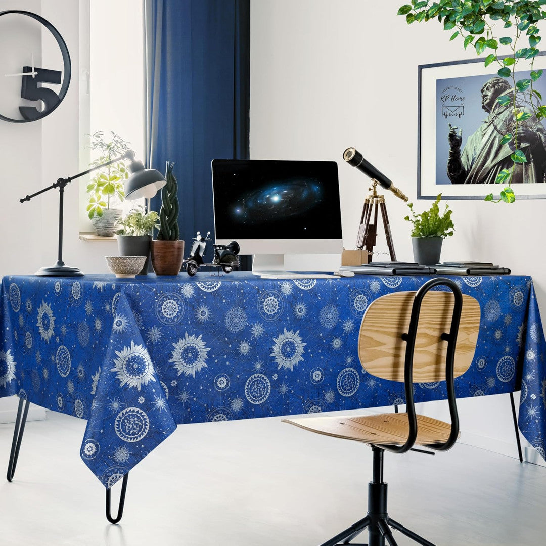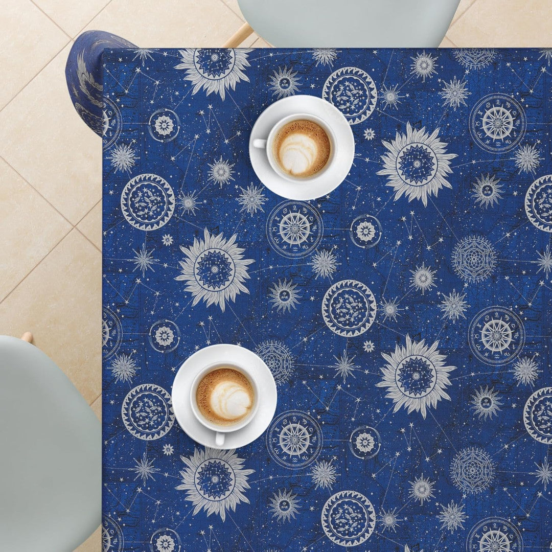 Astra Blå er en stemningsfuld voksdug med en dyb natteblå baggrund, let meleret som en mørk himmel. På overfladen spreder sølvfarvede stjerner, stjernetegn og små kosmiske rosetter sig i et harmonisk mønster, hvor fine prikker og streger skaber fornemmelsen af en ægte stjernehimmel. De større sol-/stjernerosetter veksler med mindre kompaslignende motiver, hvilket giver et smukt rytmisk spil hen over bordet.