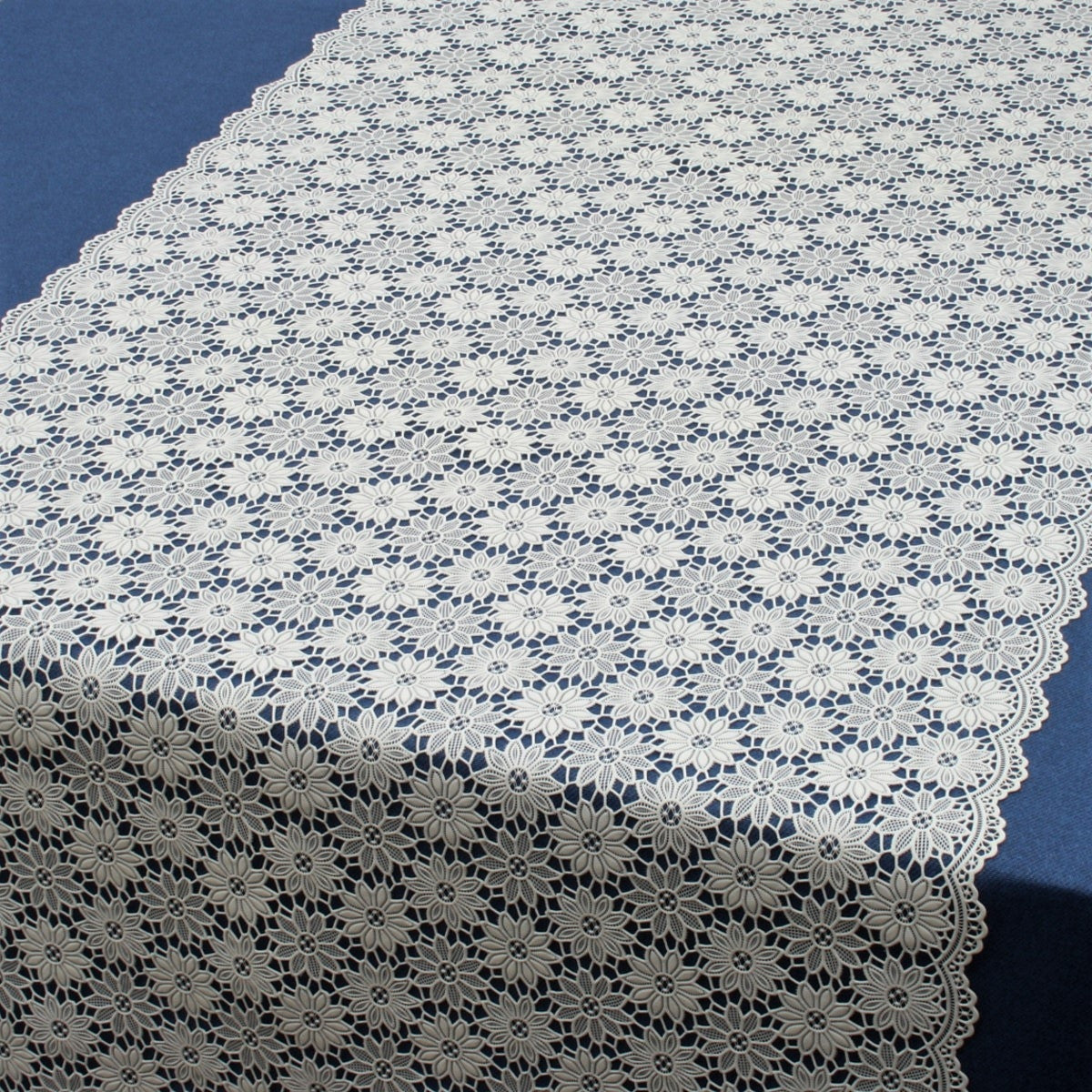 Elegant hvid blondedug med et fint blomsterdesign. Perfekt som bordløber til både hverdag og festlige lejligheder.