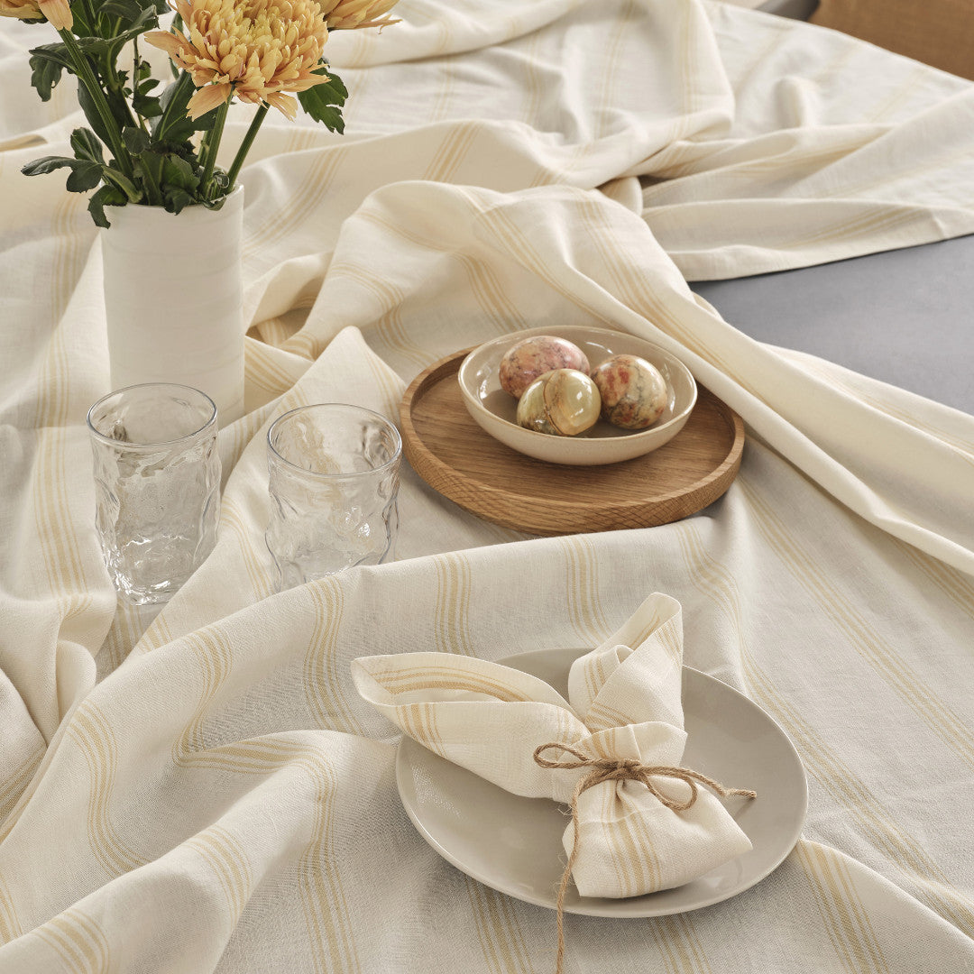 En luftig og elegant dug, der passer både til runde og kvadratiske borde, vævet i en blød blanding af hør og bomuld. De fine gule striber på den lyse ecru-baggrund skaber et lyst og indbydende udtryk – ideelt til forår og sommer, og egnet til både hverdag og særlige anledninger.