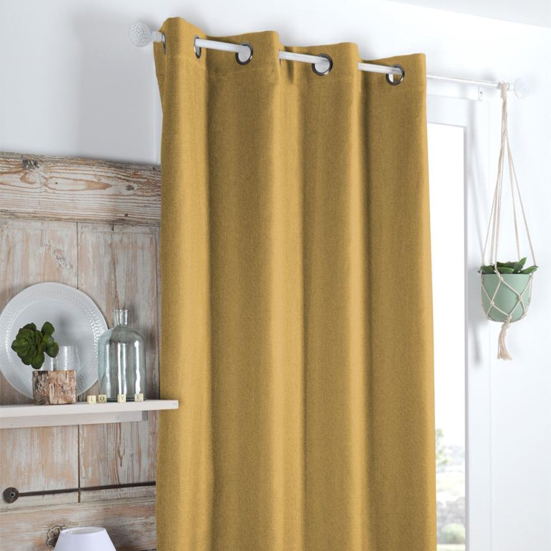 Den sennepsgule farve tilføjer en moderne og energisk kontrast til indretningen, mens den strukturerede vævning sikrer et elegant og stilfuldt look. Gardinet fungerer samtidig som et effektivt blackout-gardin, der beskytter mod lys og sikrer privatliv.