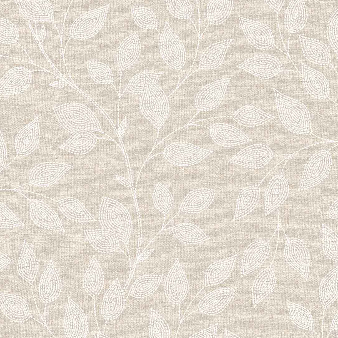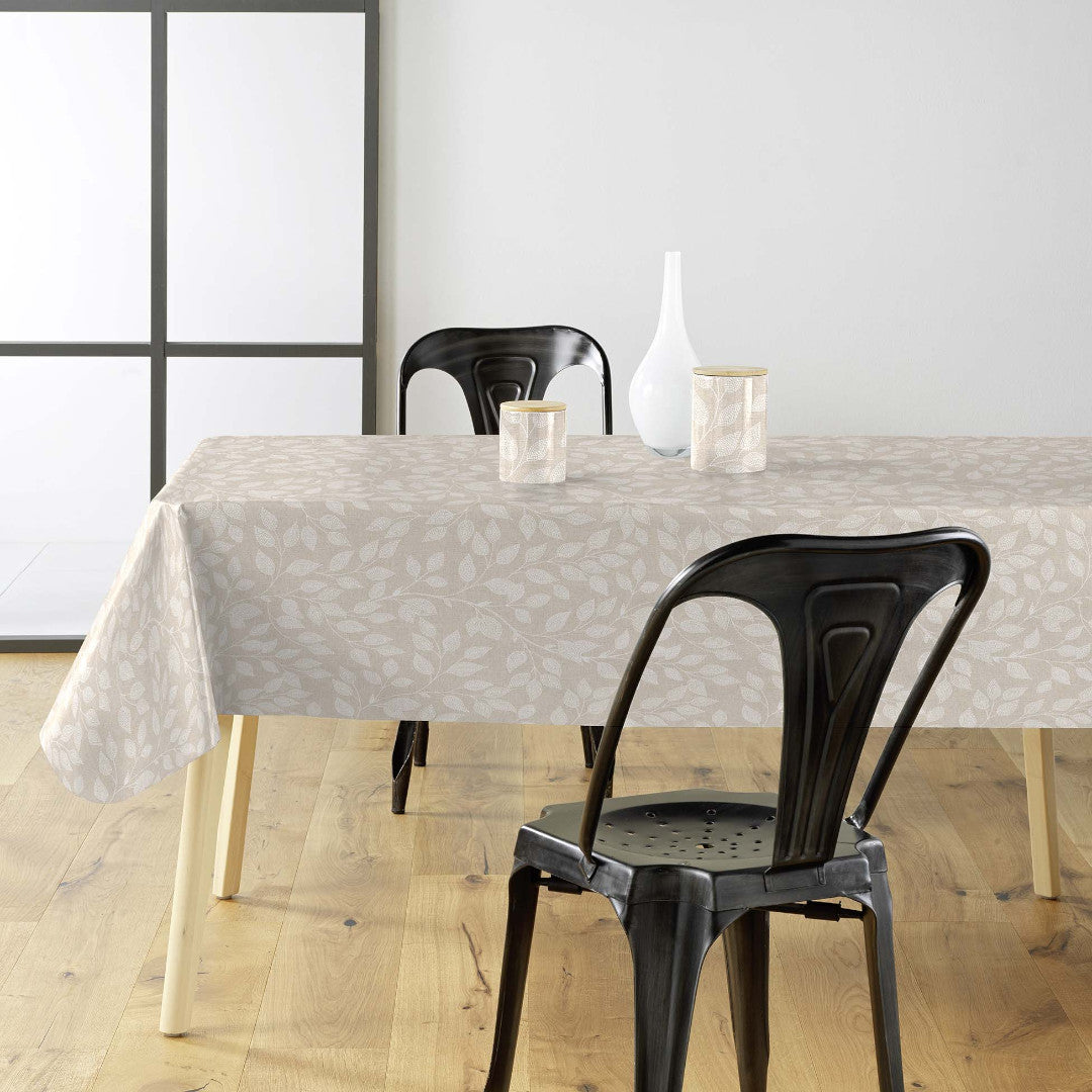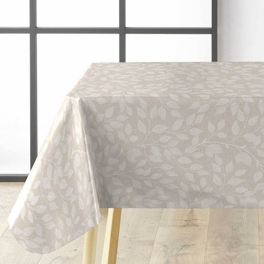 Duchesse er en voksdug med glat hørlook og et fint, hvidt bladmønster på en varm naturfarvet bund. De slanke grene og små blade danner et let og ensartet udtryk, der giver bordet ro uden at virke tomt.