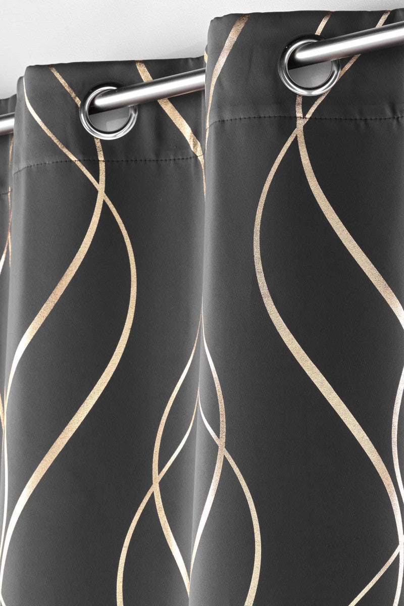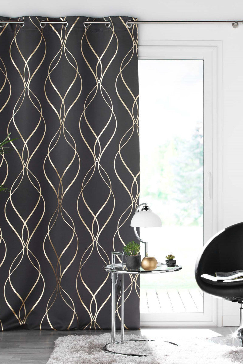 Elise Antracit er et eksklusivt mørklægningsgardin med et elegant bølgemønster i gyldne metalliske linjer, der står smukt mod den dybe antracitgrå baggrund. Det moderne design skaber en luksuriøs og sofistikeret stemning i rummet.