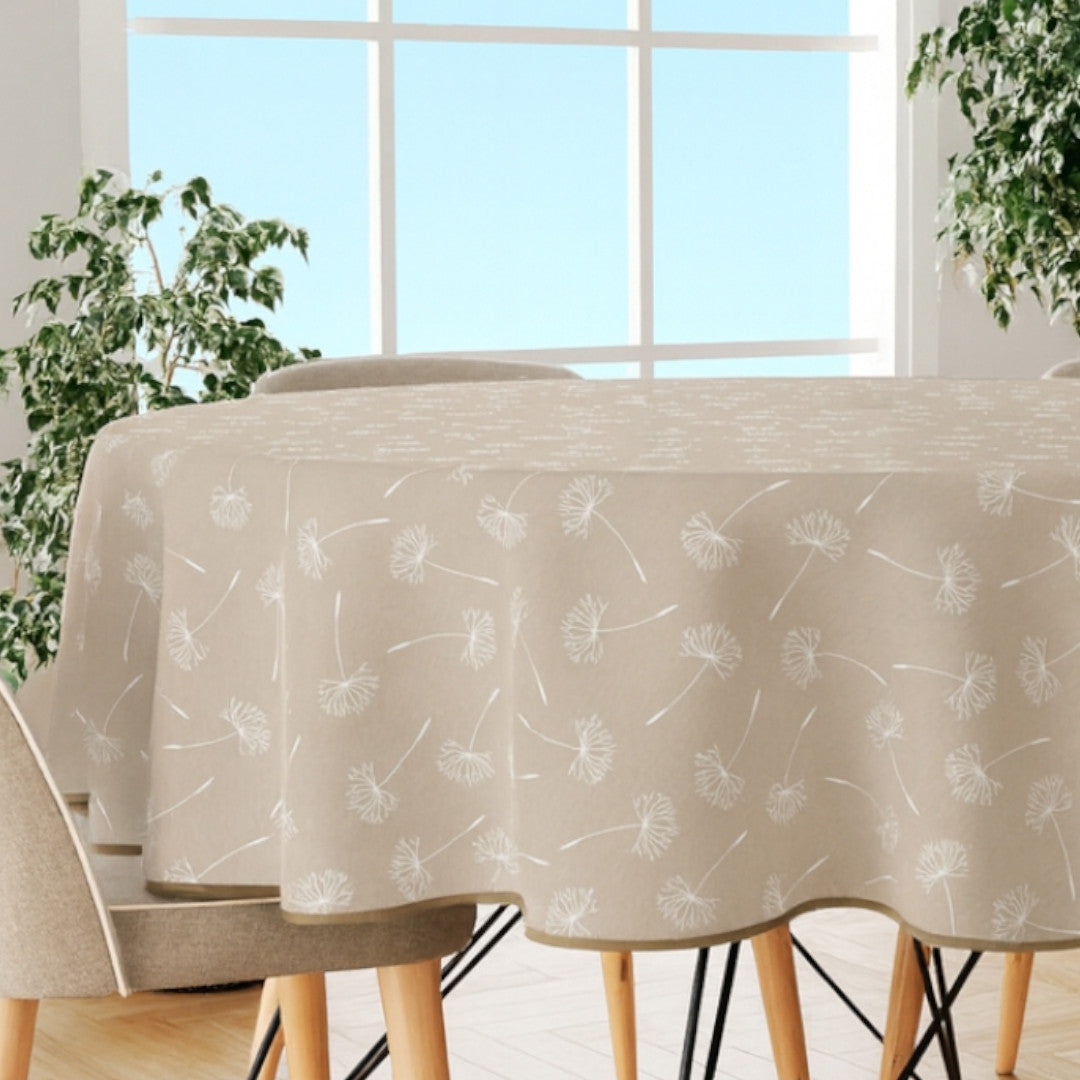 Frøvik Beige er en smuk rund voksdug med glat overflade og en støvet beige farve, der giver et varmt og roligt udtryk til borddækningen. Det fine motiv af florlette mælkebøttefrø i hvide nuancer svæver let hen over dugen og tilføjer et poetisk og nordisk præg.