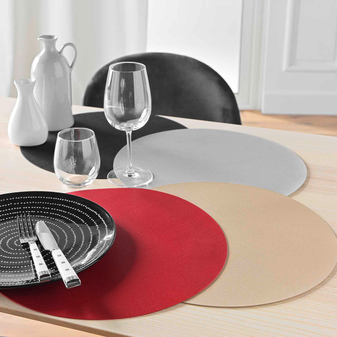 Denne runde dækkeserviet i imiteret læder med en gylden farve giver bordet et elegant og festligt udtryk. Den bløde guldtone er stilfuld uden at være prangende og passer flot til både hvide, sorte og farvede service.