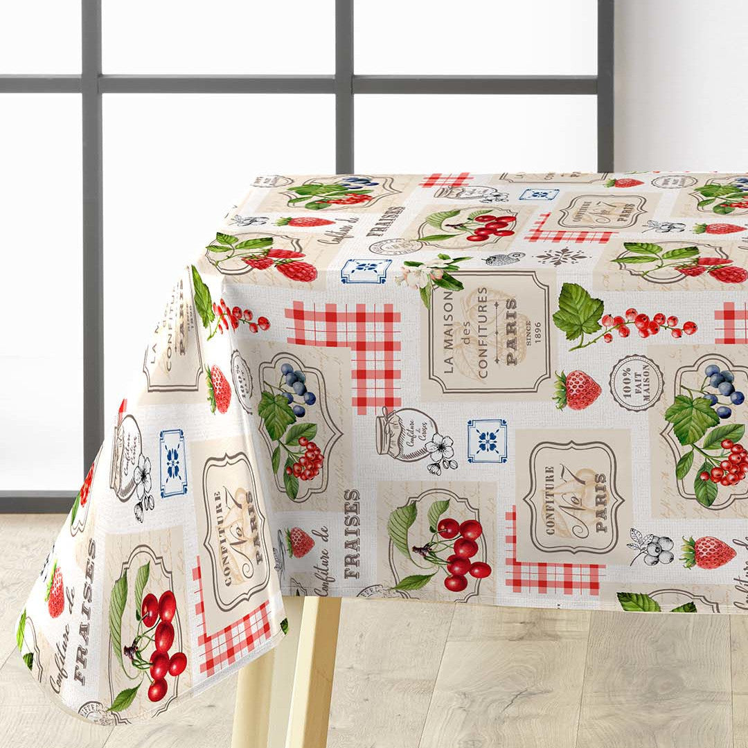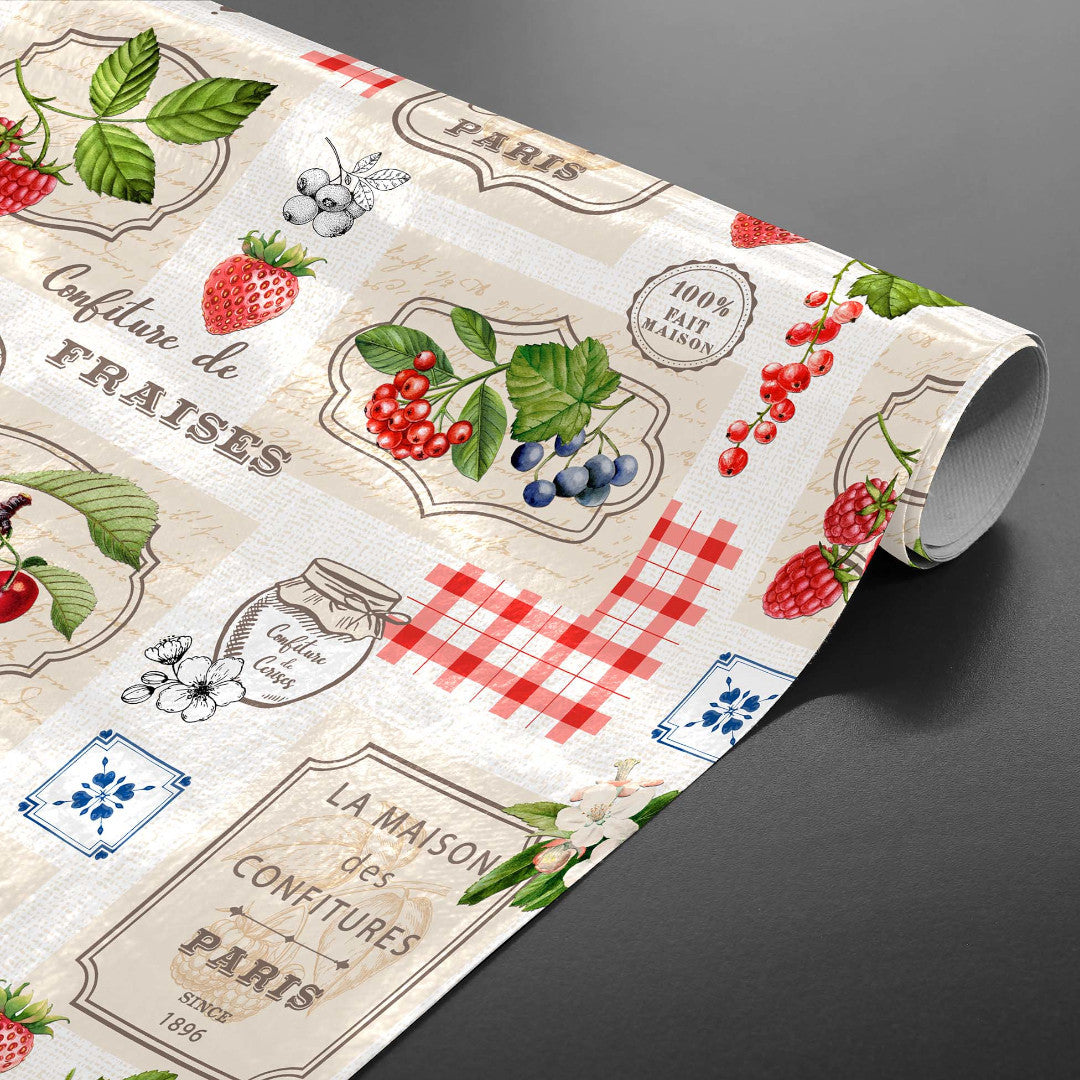 Voksdugen GRIOTTE har et charmerende design inspireret af det franske landkøkken. Mønstret viser kirsebær, jordbær, ribs og hindbær, sammen med tern, etiketter og dekorative detaljer i varme farver. Tekster som "Confiture de Fraises" og "La Maison des Confitures" giver et autentisk, nostalgisk præg, der leder tankerne hen på hjemmelavede marmelader og hyggelige stunder i køkkenet.