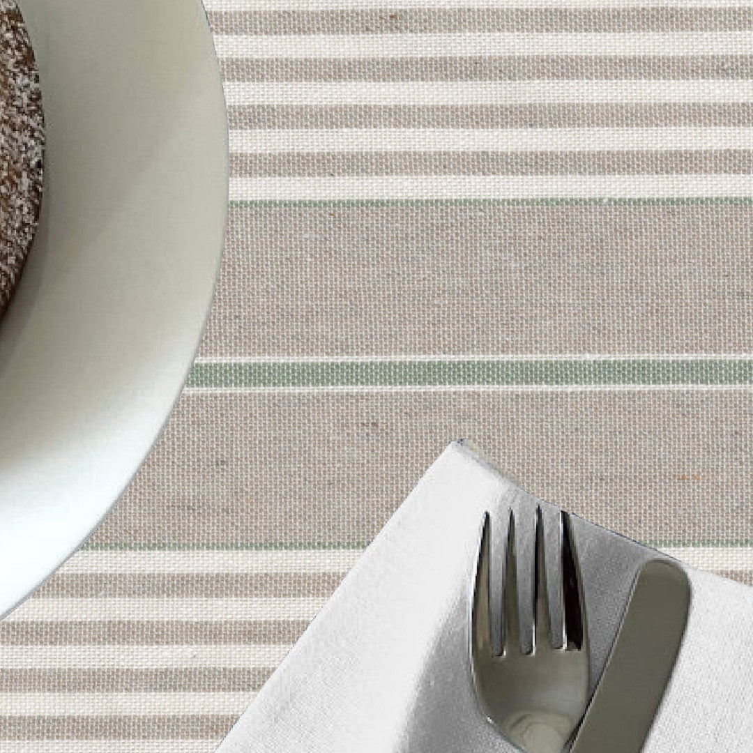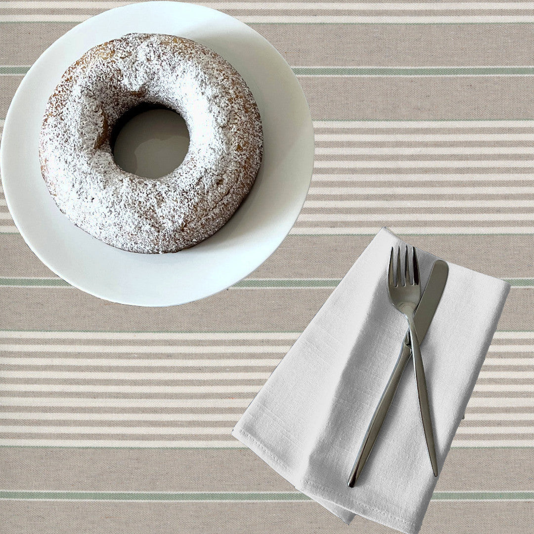 Striberne løber på langs af bordet, hvilket tilfører en elegant visuel effekt. Hørlookets rustikke tekstur giver et naturligt og autentisk præg, mens akrylbelægningen gør dugen vandafvisende, slidstærk og nem at rengøre. En praktisk og tidløs løsning til både hverdag og festlige anledninger.