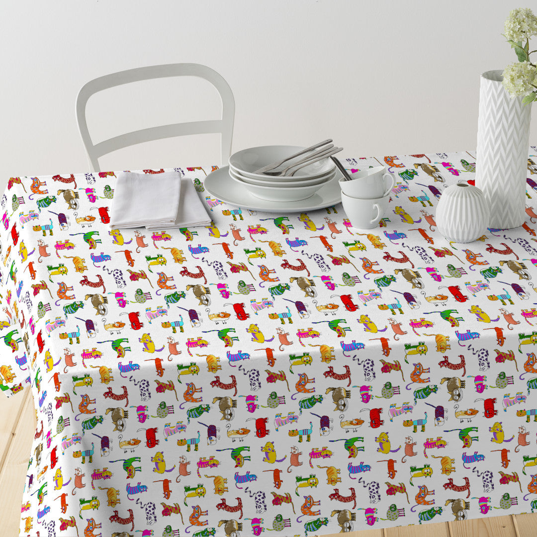 En livlig og glad dug fyldt med skøre, farverige katte, der vækker smil hos både børn og voksne. Mønstret er håndtegnet og trykt på en let offwhite bund, der lader farverne træde tydeligt frem uden at virke for kraftige.