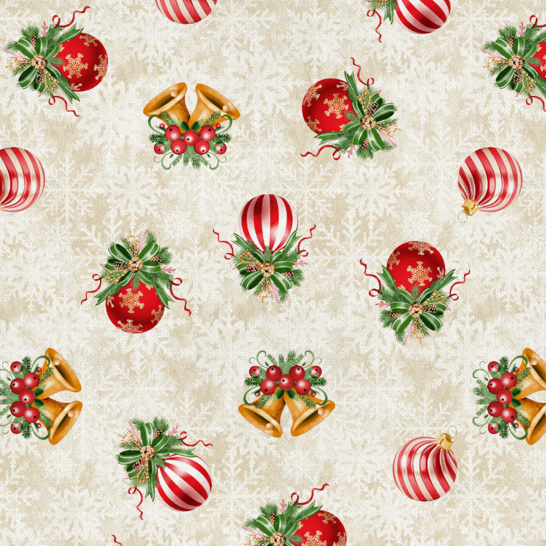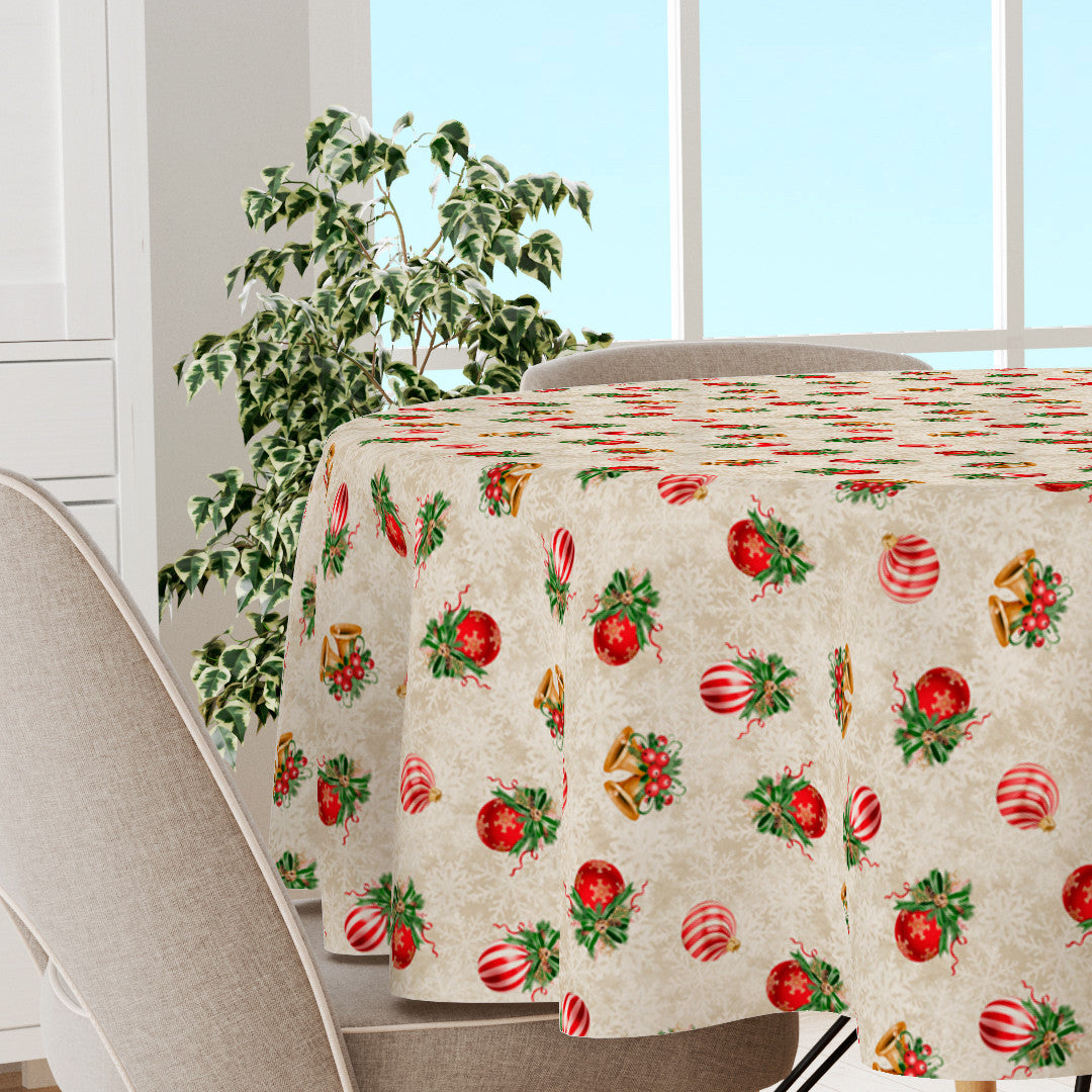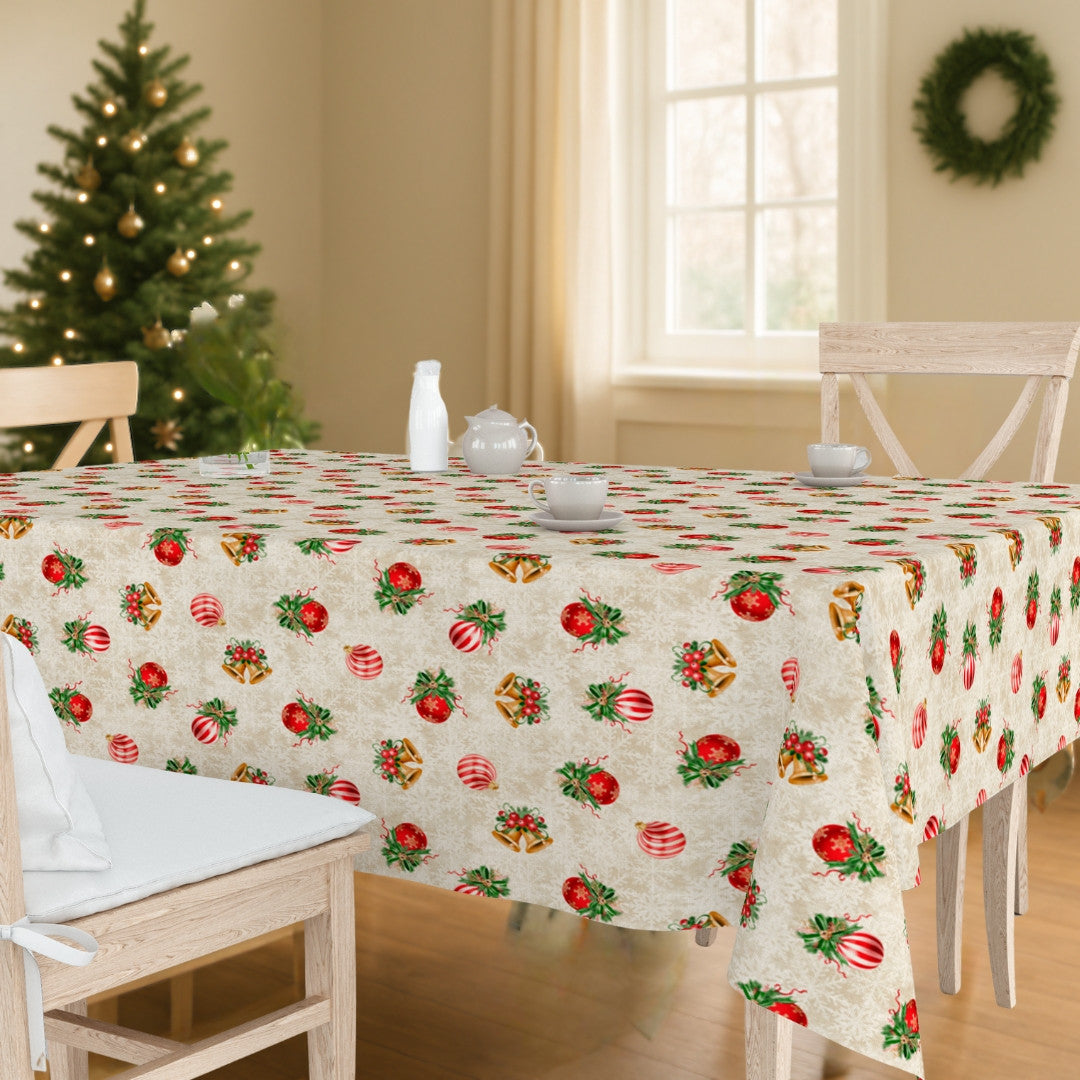 Juleklokke bringer klassisk julestemning til bordet med sine røde julekugler, gyldne klokker og grønne grangrene – alt sammen sat mod en lys baggrund. De fine detaljer og gyldne toner giver dugen et elegant og festligt udtryk, der passer perfekt til både julemiddage og hyggelige adventsstunder.