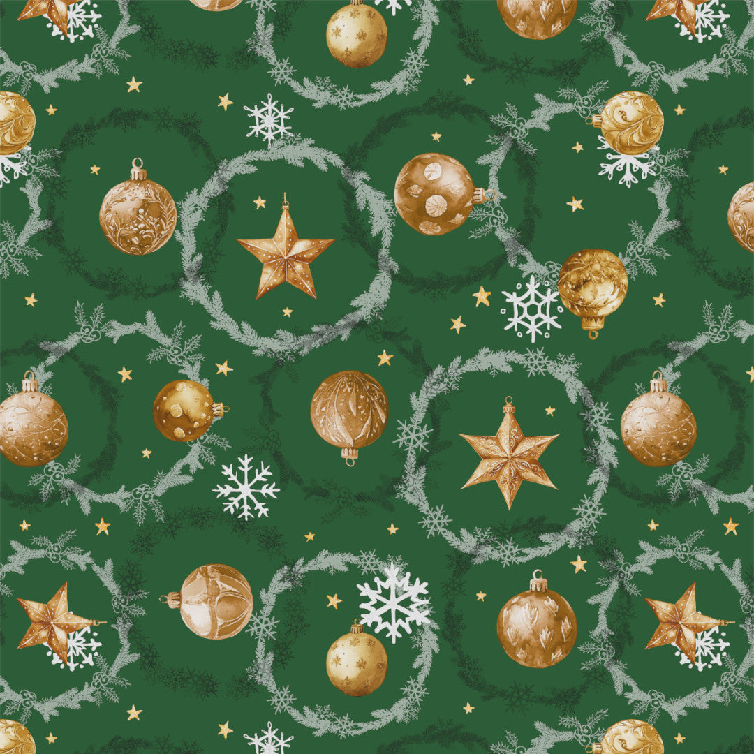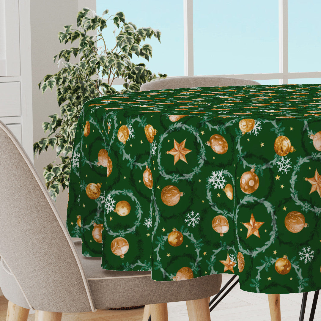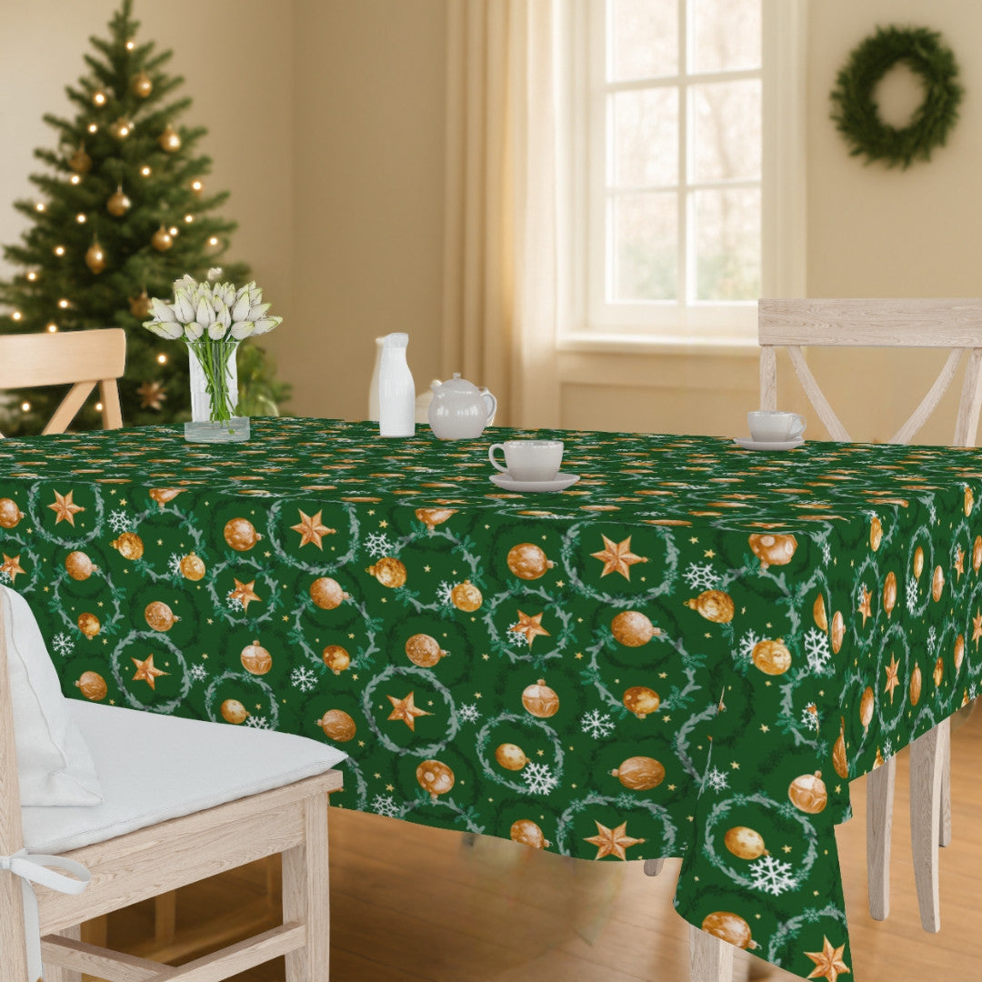 Med en dybgrøn baggrund og glimtende gyldne julekugler er denne voksdug som et stykke af grantræets magi midt på bordet. De fine kranse og snefnug løfter helheden og skaber den perfekte stemning til både hverdag og julefest. Farverne giver en levende kontrast og en snert af vintage-charme.