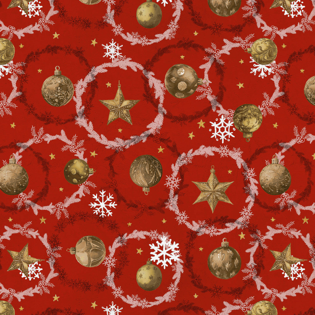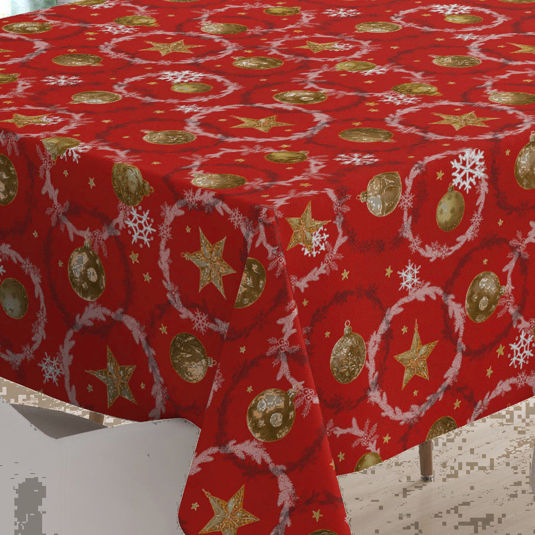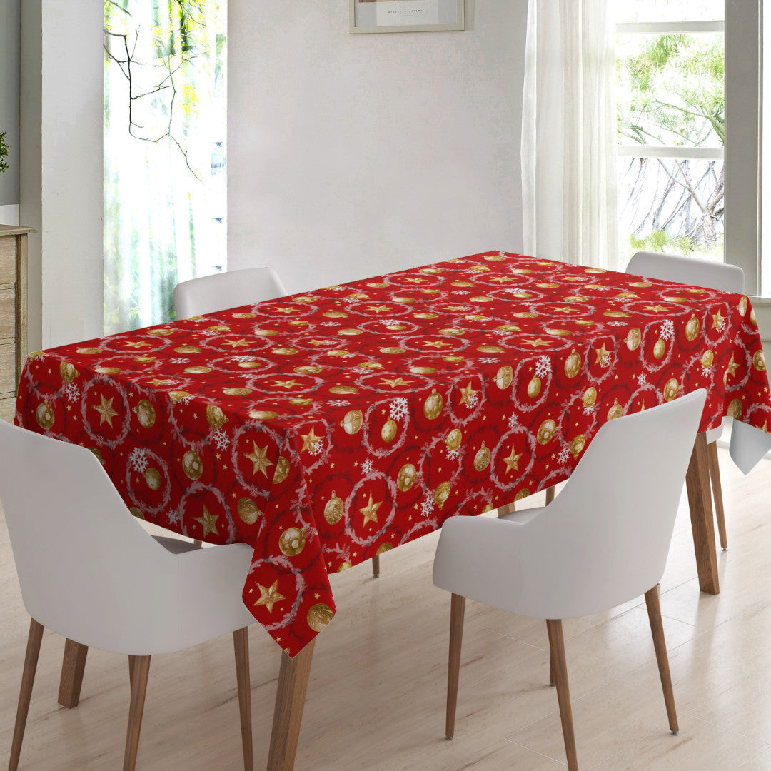 Den klassiske røde juledug emmer af varme og tradition. Med gyldne julekugler, stjerner og snefnug på en dyb rød baggrund bringer den straks tankerne hen på duften af gran og lyden af juleklokker. Det detaljerede tryk med kranse og ornamenter skaber en festlig stemning, der sætter prikken over i’et på enhver julemiddag.