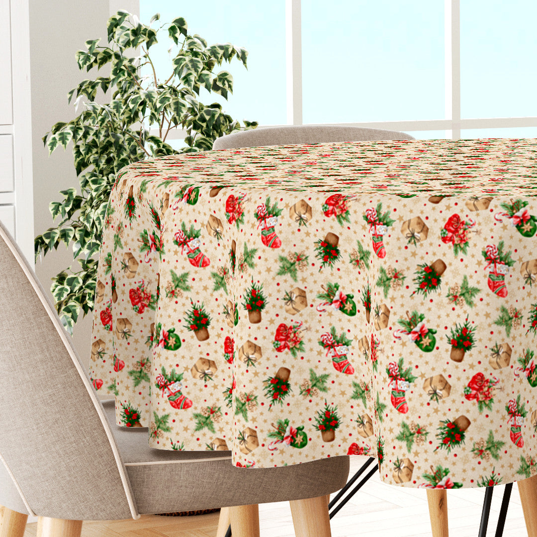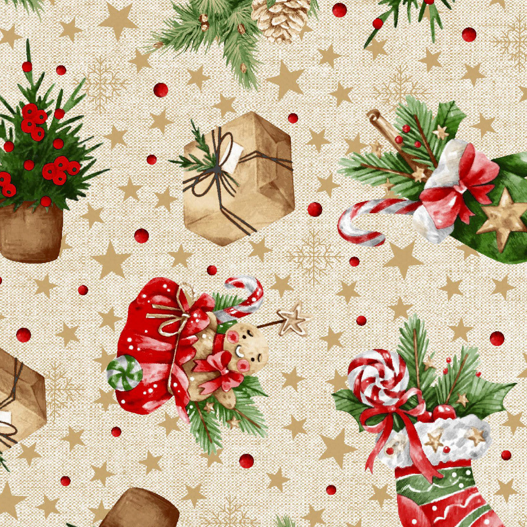 Julesok & Gaveglæde er dugen, der indfanger alt det, vi forbinder med en klassisk jul. Her mødes julesokker, gaver, kogler, gran og stjerner i et varmt og livligt mønster, der skaber ægte decemberstemning omkring bordet.