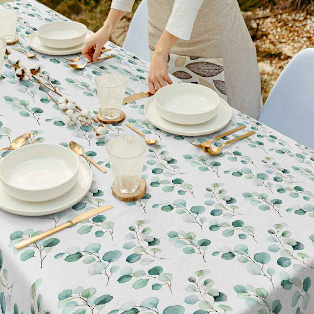 Junos er en let og luftig dug med et botanisk mønster i vandfarver, hvor grønne og blågrønne eucalyptusgrene svæver elegant hen over en hvid baggrund. Farverne spænder fra støvet mint til mørkere blågrønne toner og giver dugen en friskhed og ro, som er nem at bringe ind i både hverdag og særlige anledninger.