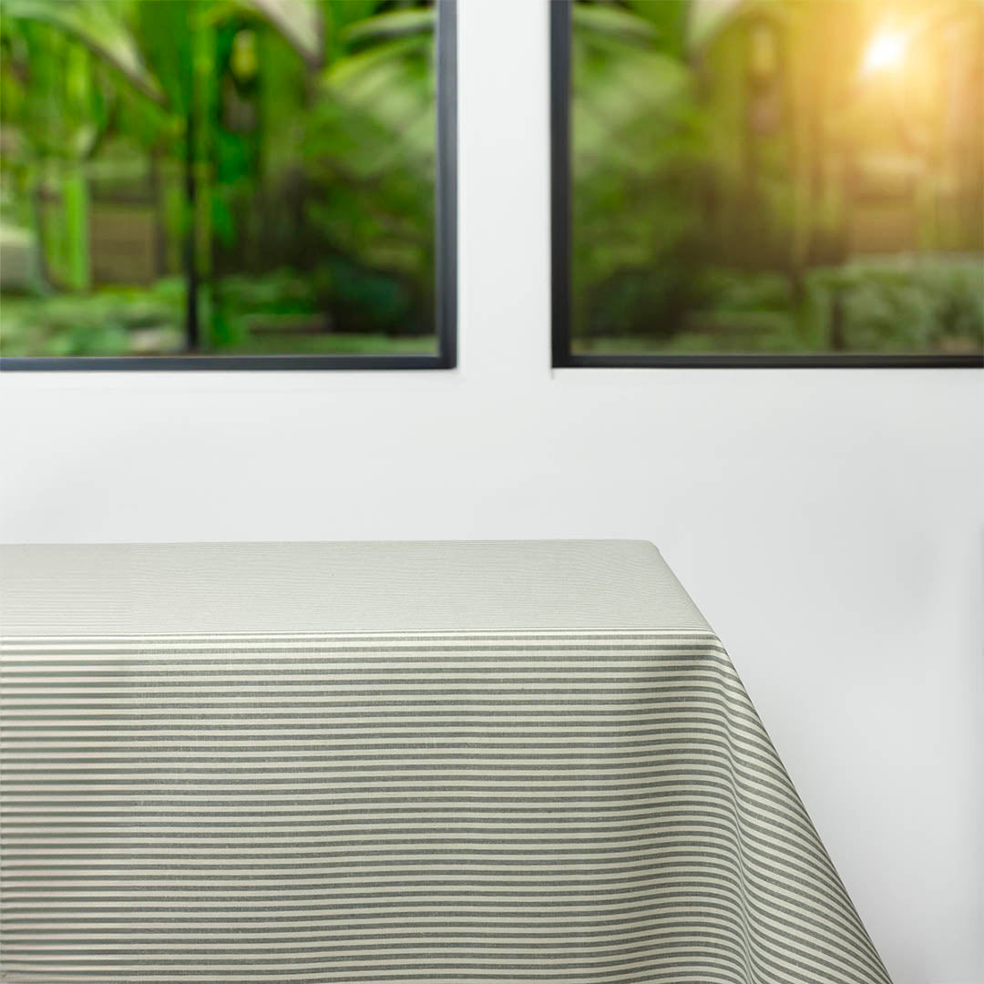 Akryldugen Sommerstriber har fine tynde striber, der har en tykkelse på 0,5 cm. Farverne er hvid og grå. Alt afhængig af, hvordan lyset falder, kan du ane en blå eller en grøn tone i de grå striber.