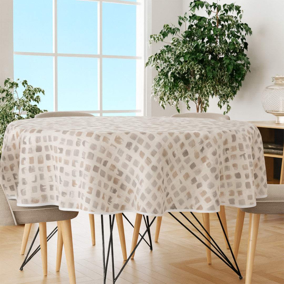 Leonor Beige er en rund voksdug i Ø 180 cm med glat overflade og et let kunstnerisk udtryk. Mønstret består af små, håndmalede penselstrøg i beige, grå og bløde brunlige nuancer – en varm og rolig farvepalet, der klæder både lyse, nordiske hjem og mere naturlige, rustikke omgivelser.