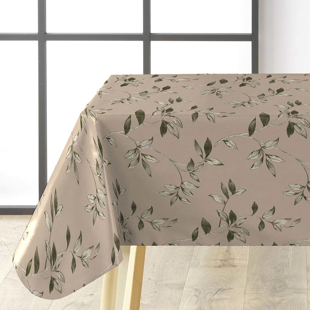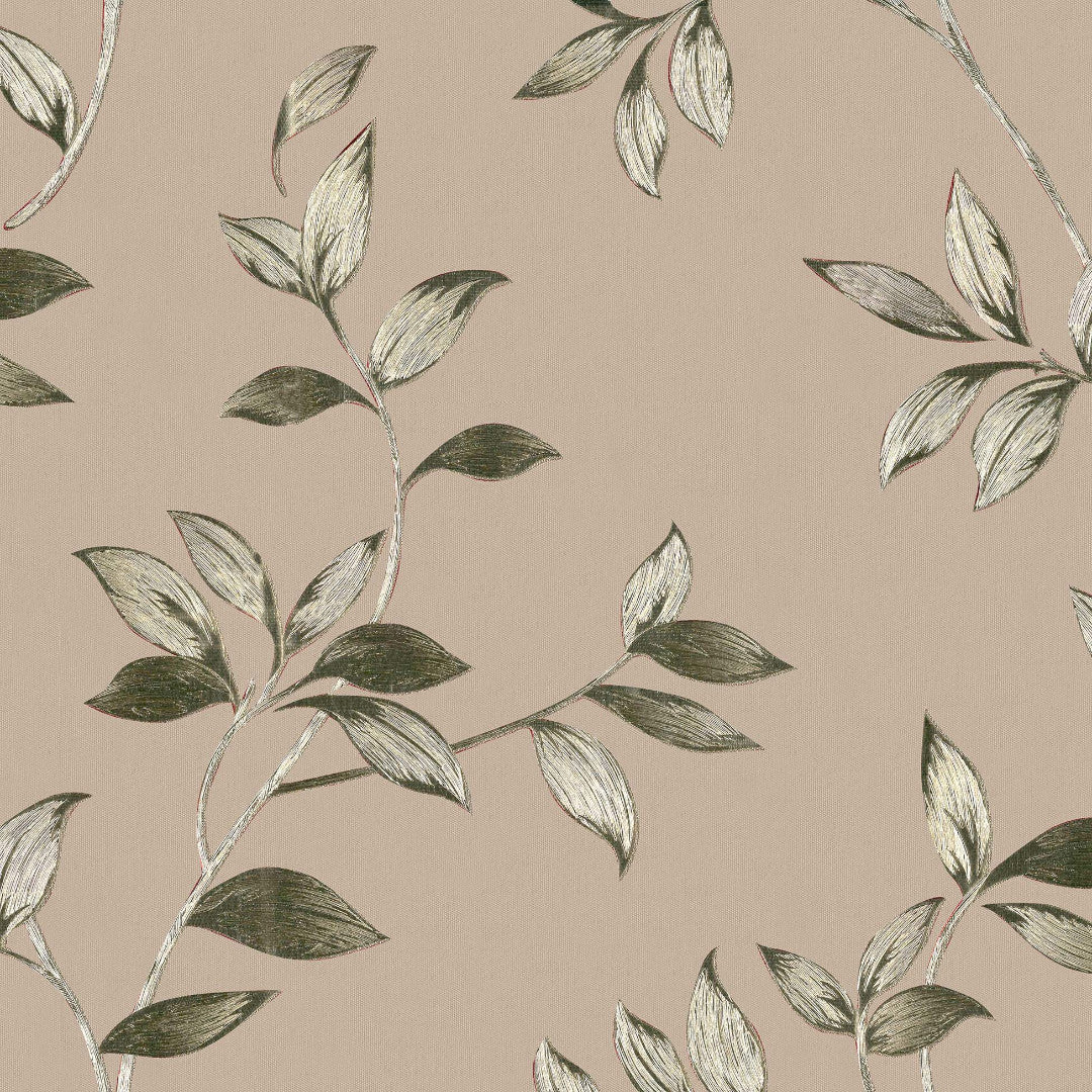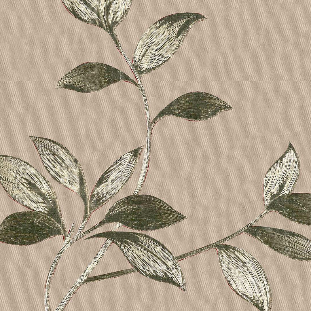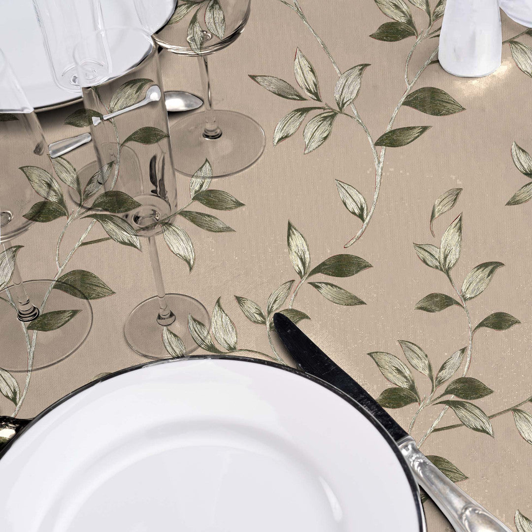 Liane Golden Vine har et naturligt mønster med bladranker i afdæmpede grønne og gyldne toner på en varm, beige baggrund. Designet er let og harmonisk, med en rolig rytme, der passer til både hverdagsbrug og dækkede borde.