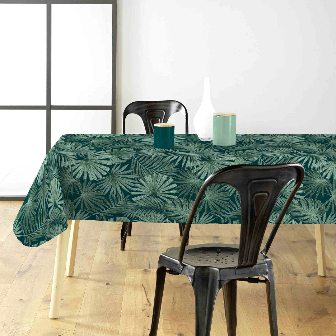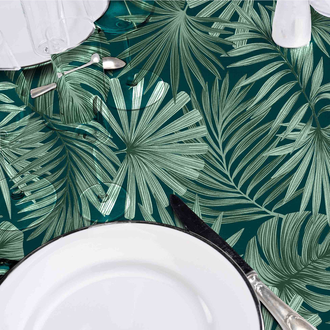 De fine linjer i bladene giver dugen et let grafisk præg, mens farvesammensætningen holder helheden afdæmpet og harmonisk. Det mørke grønne underlag giver dybde og gør mønstret markant, uden at det tager al opmærksomheden fra resten af bordet.