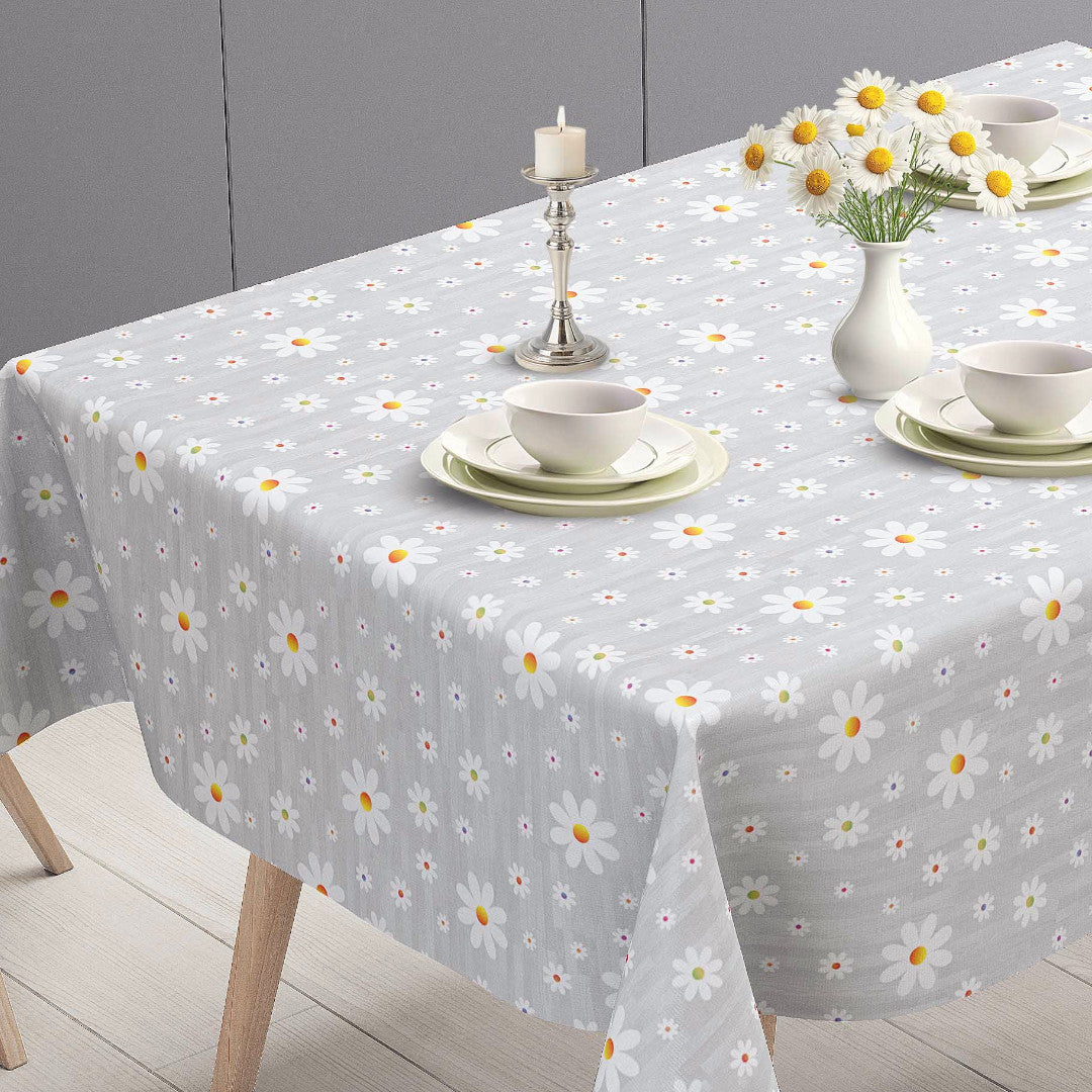 Marguerite er en lys og dekorativ voksdug med et enkelt og sommerligt blomsterprint. De hvide margueritter med midter i forskellige farver er spredt over den grå bund og giver bordet et friskt og sommerligt udtryk.