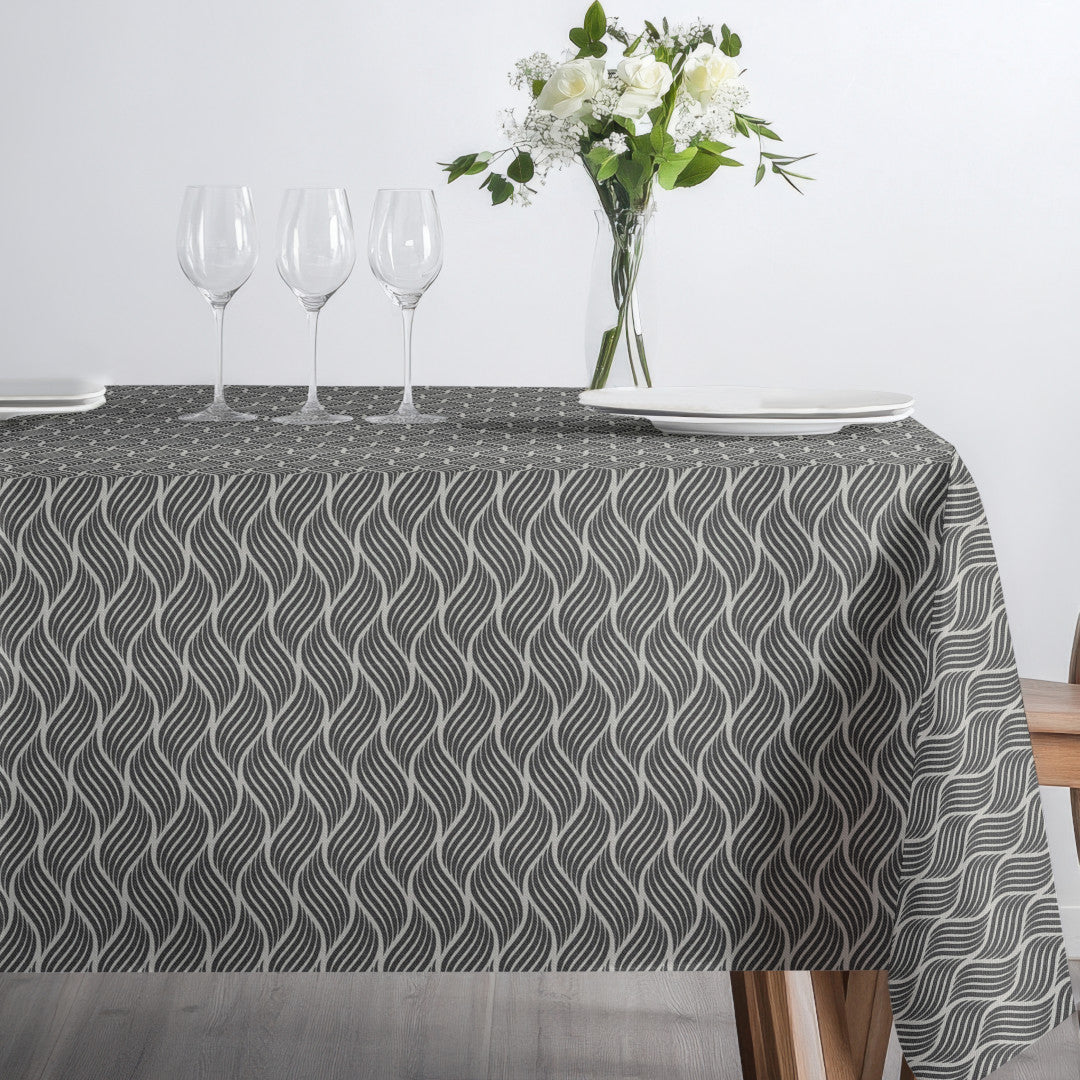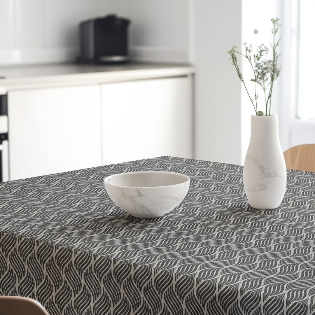 Mercedes Antracit er en akryldug med et elegant bølgende mønster i antracit og lyse kontraster. De organiske linjer skaber et levende og dekorativt udtryk, som giver bordet karakter uden at virke dominerende.