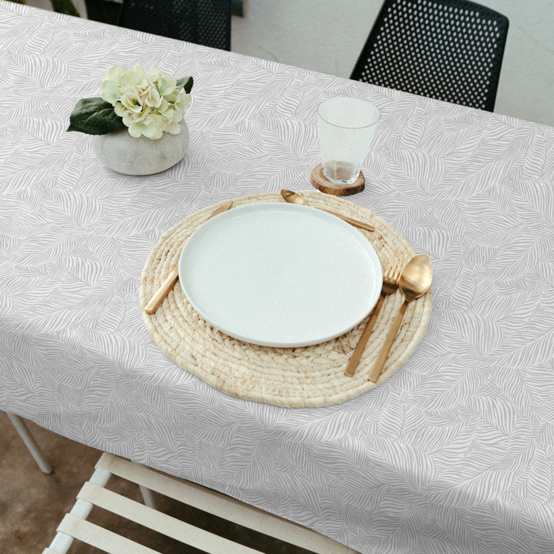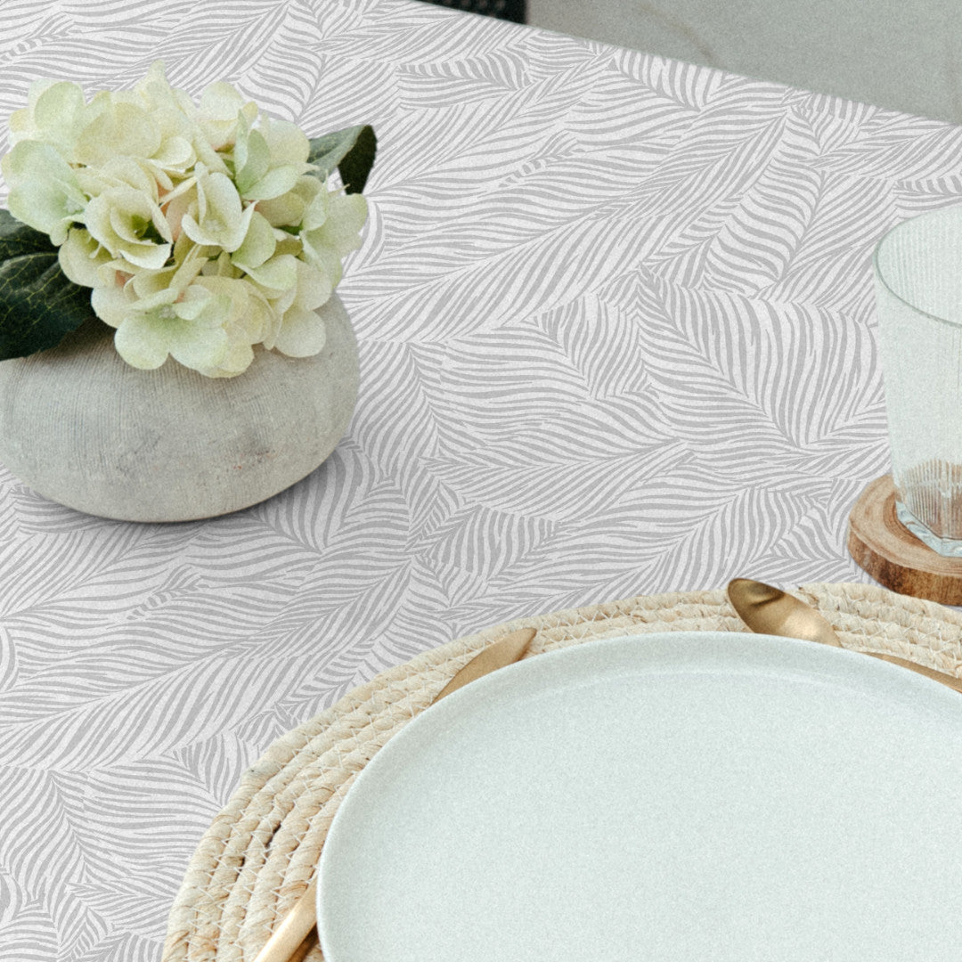 Nanda Grå er en akryldug med et roligt og harmonisk mønster af lysegrå palmeblade på hvid baggrund. De bløde, organiske linjer giver et næsten håndtegnet udtryk og en let, naturlig stemning omkring bordet.