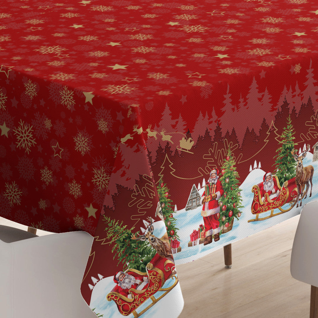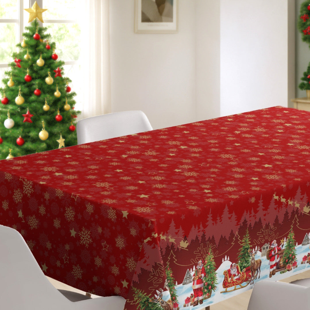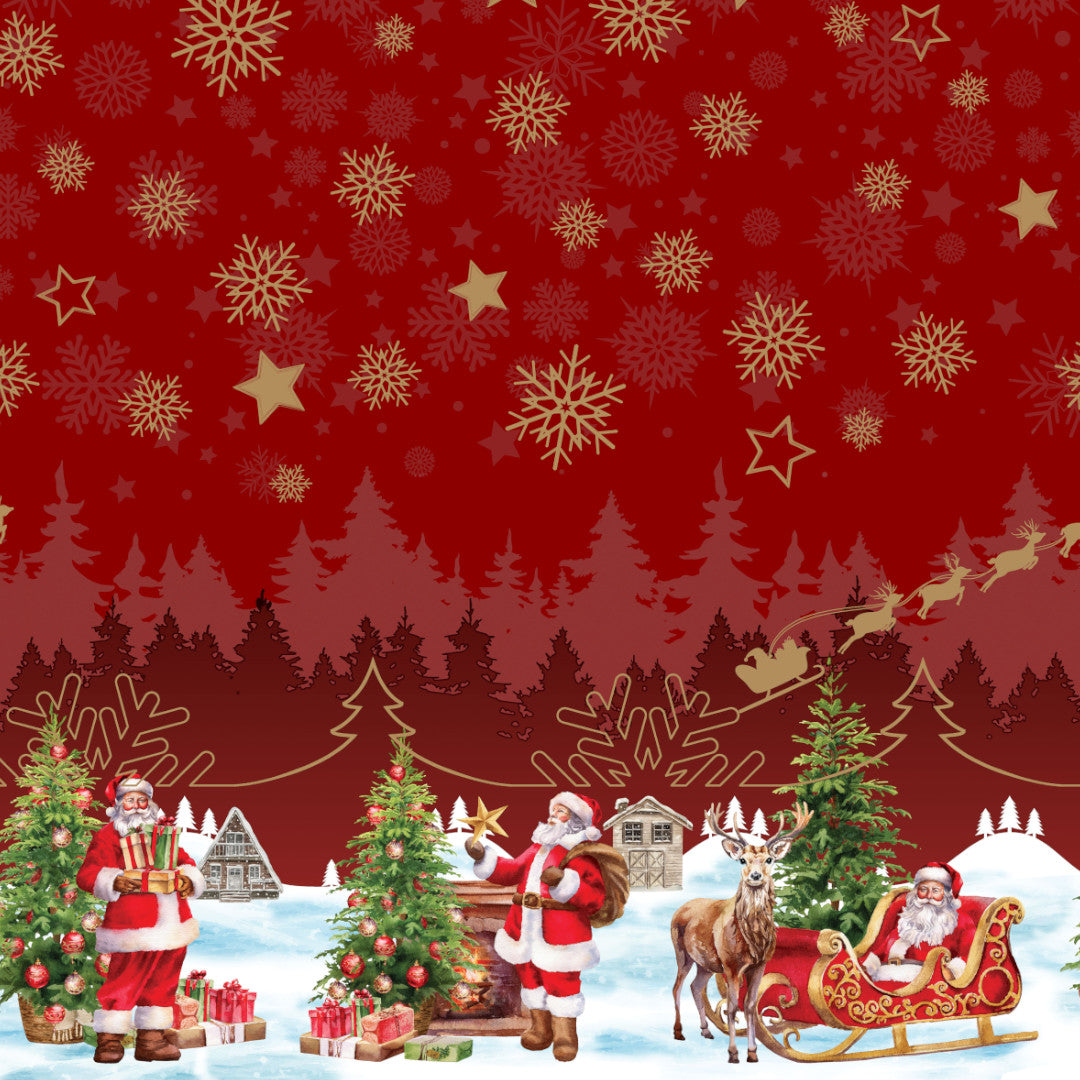 Med Nisseby julevoksdug bliver december lidt hyggeligere. Den varme røde baggrund er pyntet med nisser, juletræer, rensdyr og små hytter i sneklædt landskab. Midten af dugen er dækket af gyldne snefnug og stjerner, som giver borddækningen en klassisk og festlig julestemning.