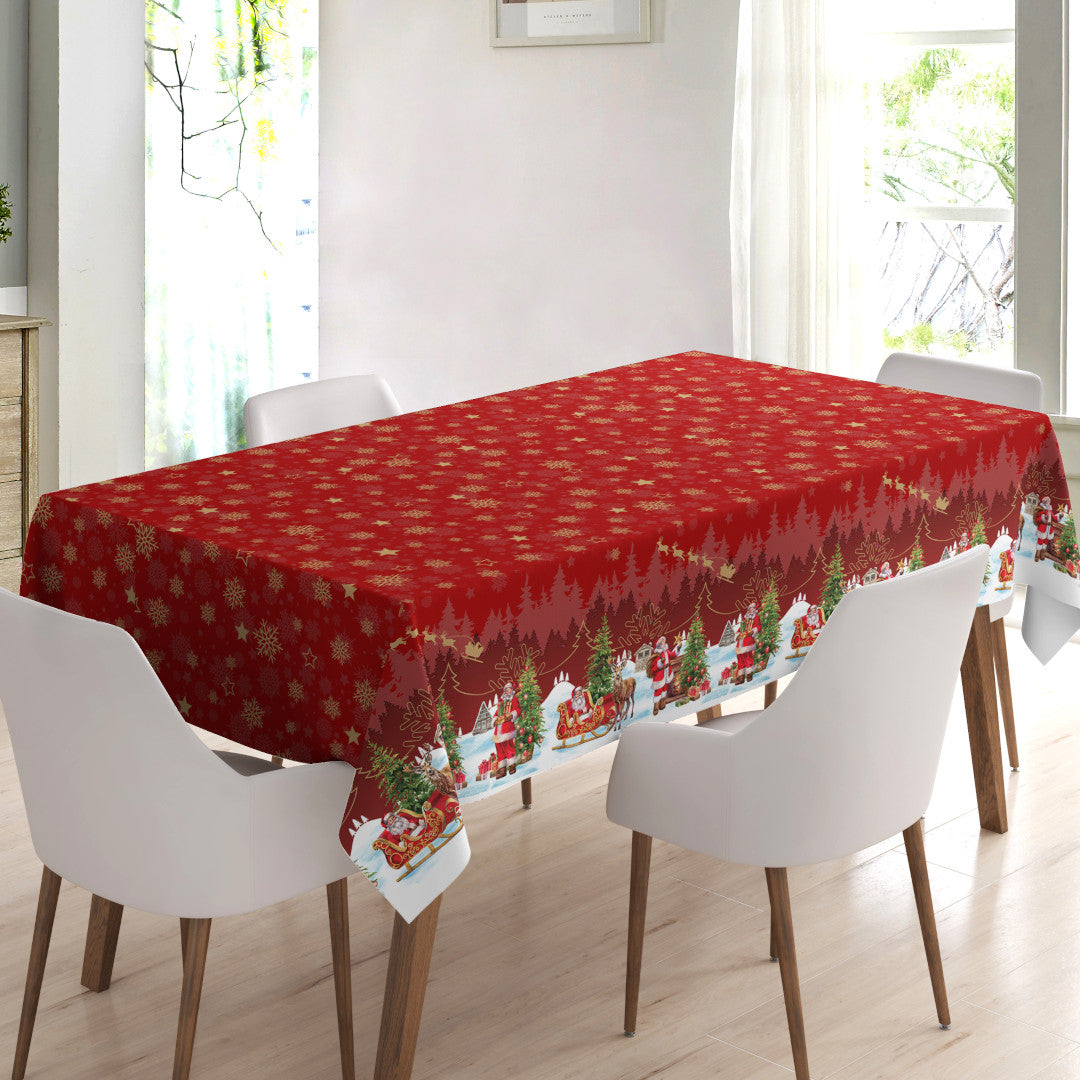 Nisseby – Rød julevoksdug med julemand og sneklædt landskab