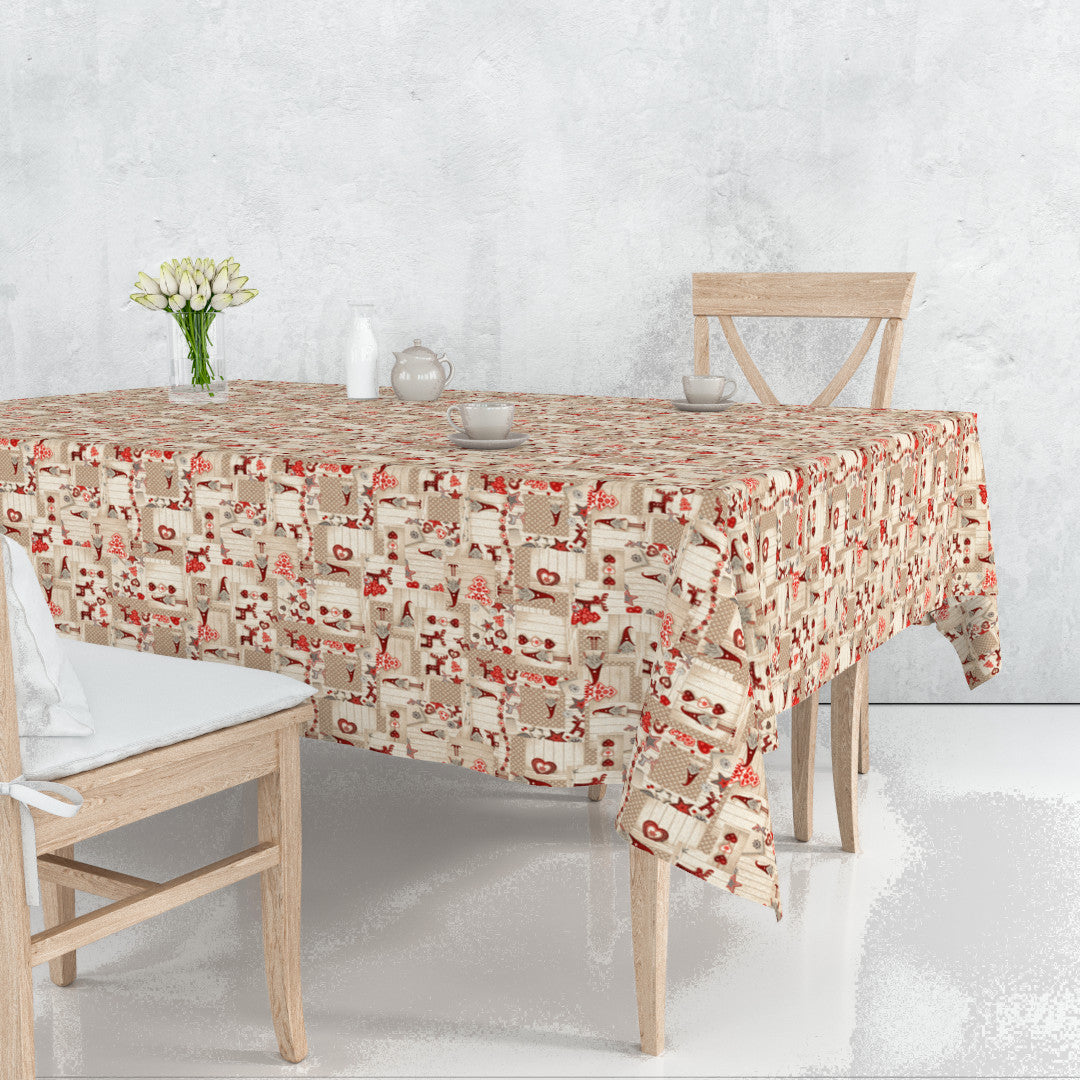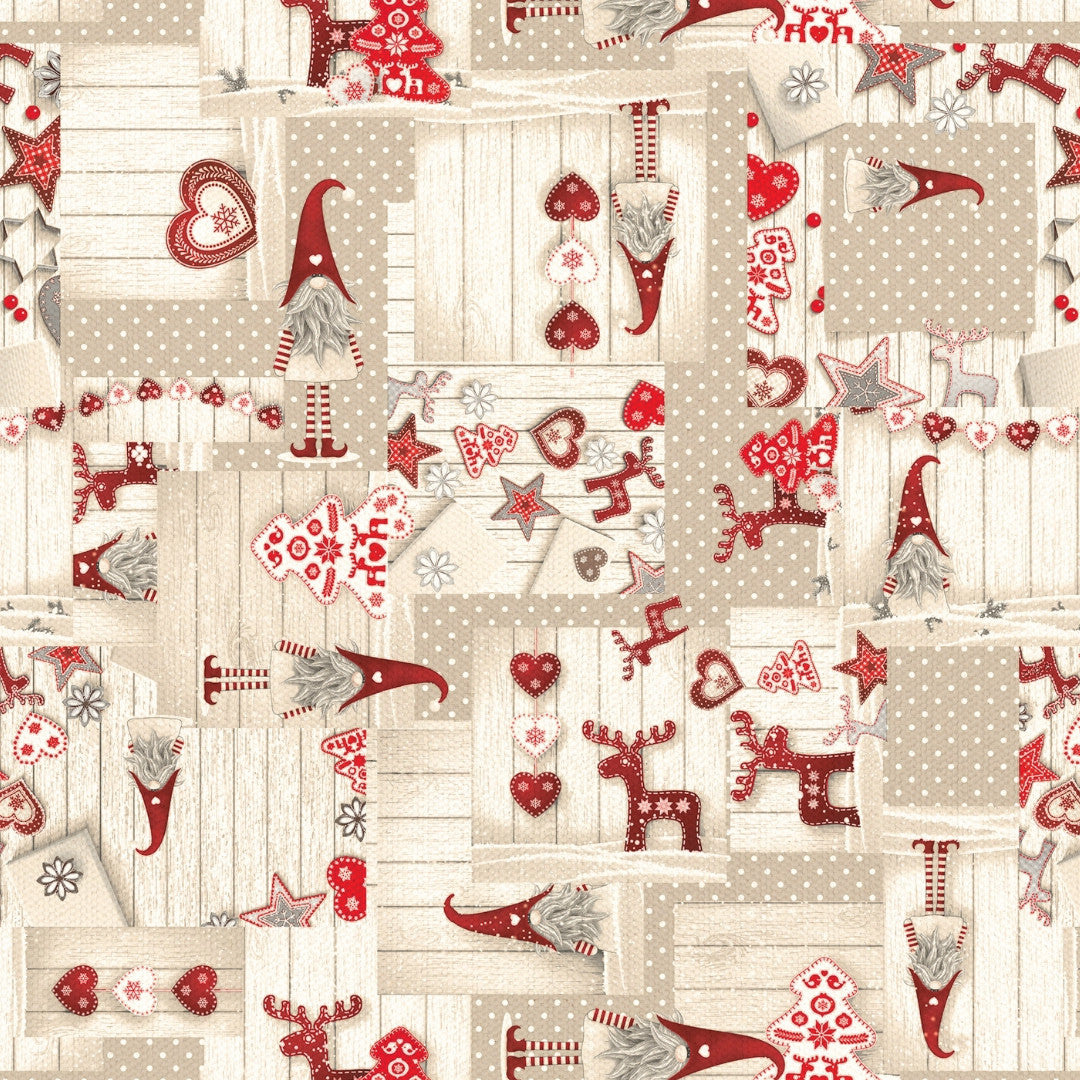 Nissehjerte forener det bedste fra den nordiske jul – hyggelige nisser, fine hjerter, stjerner og små rensdyr sat sammen i et varmt patchworkmønster. Farverne i rødt, hvidt og beige giver dugen et roligt og rustikt udtryk, som passer perfekt til både landlig og moderne indretning.