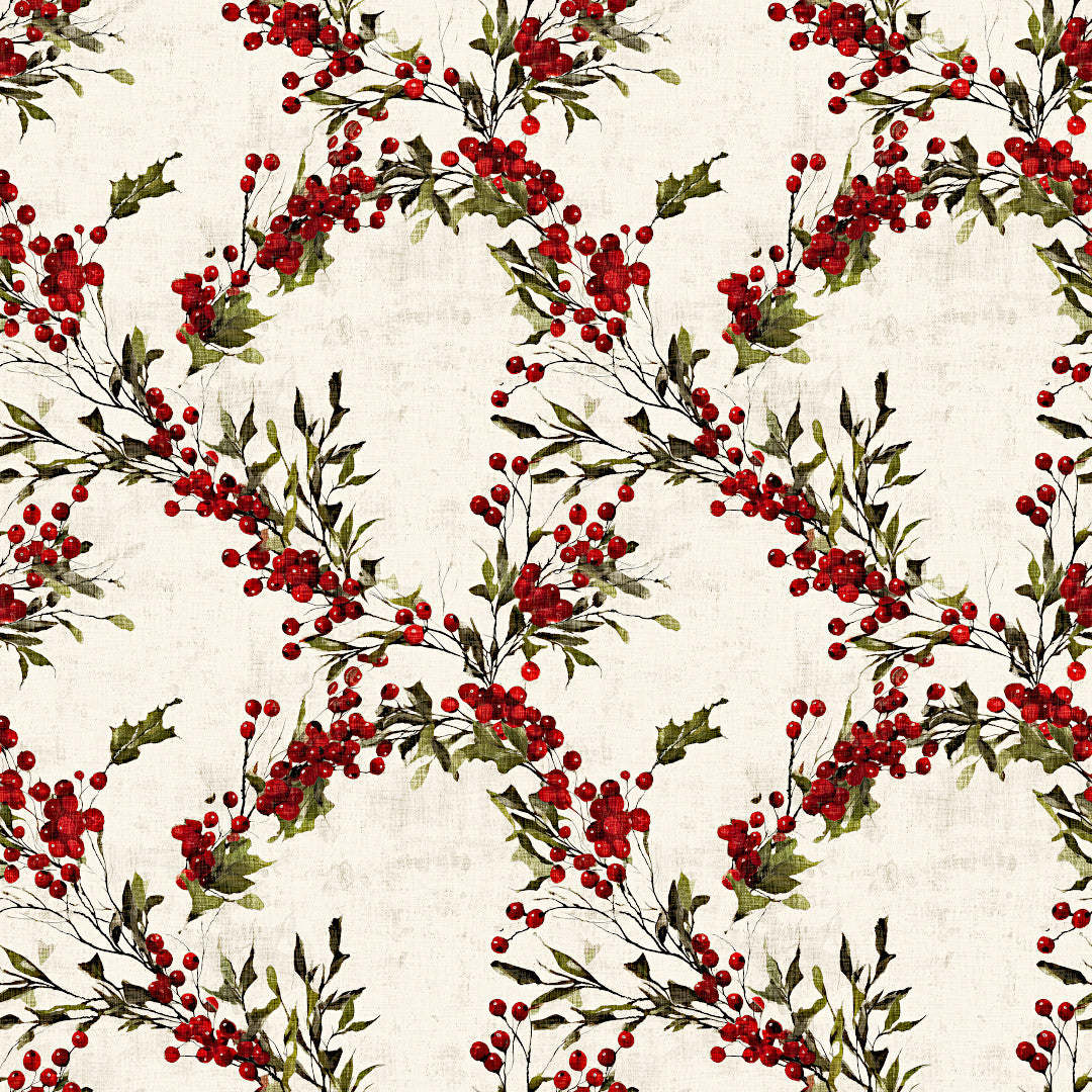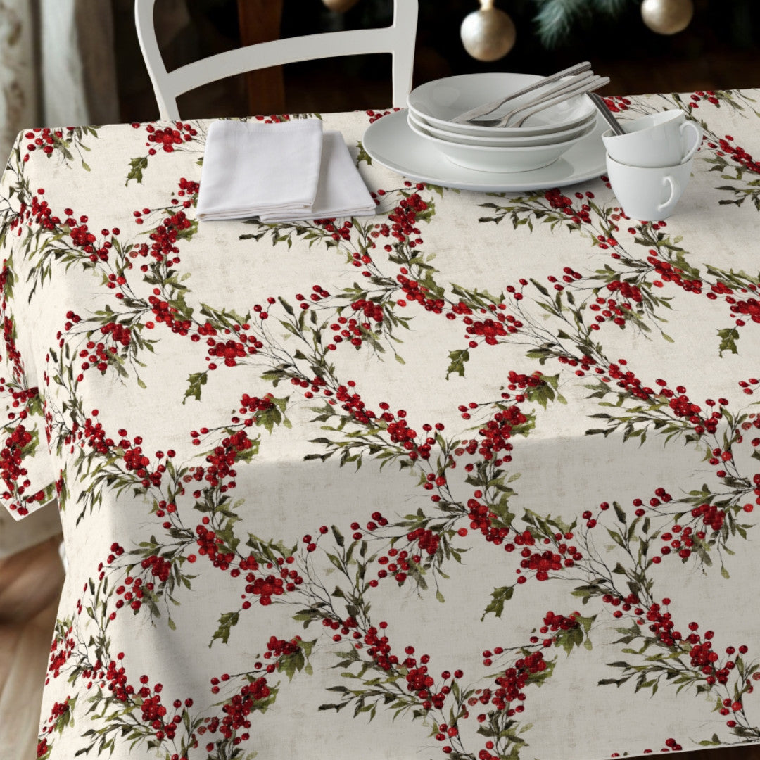 Nordfavn Bessie er en elegant juleakryldug med et klassisk mønster af røde bær og grønne grene på en lys, lidt meleret naturlig bund. Mønstret har et let, håndmalet udtryk, som giver dugen en varm og levende karakter uden at virke tung. Den emmer af nordisk jul – enkel, traditionel og smuk.