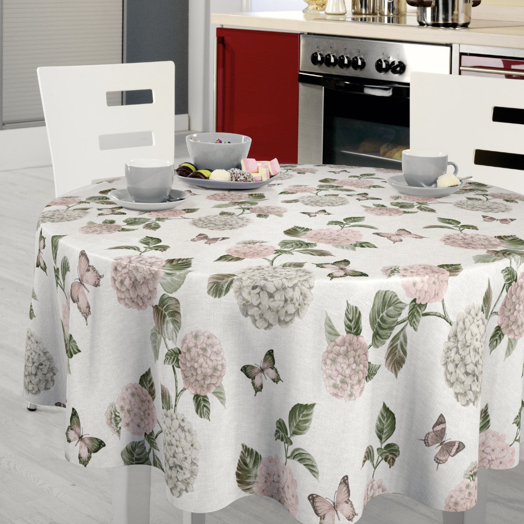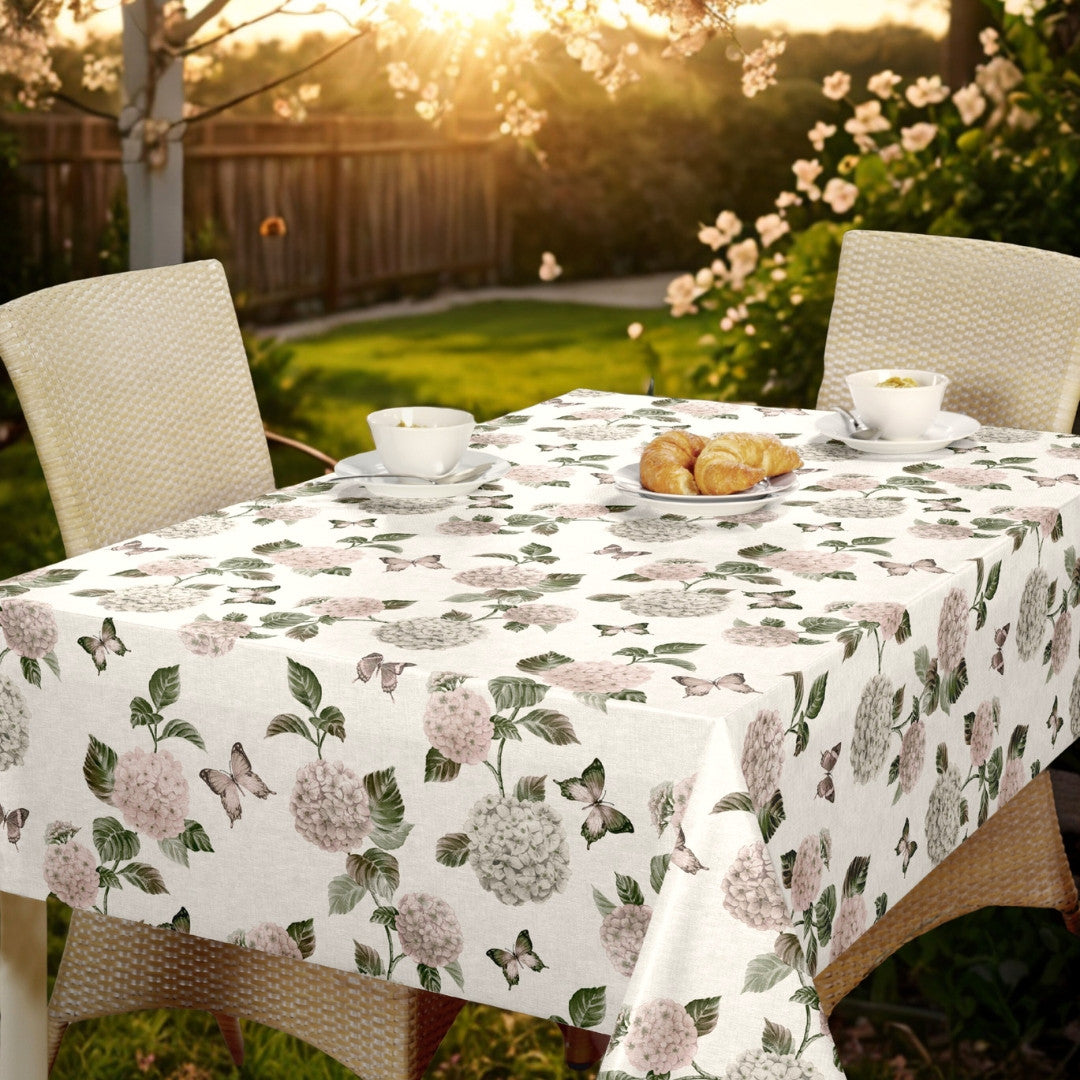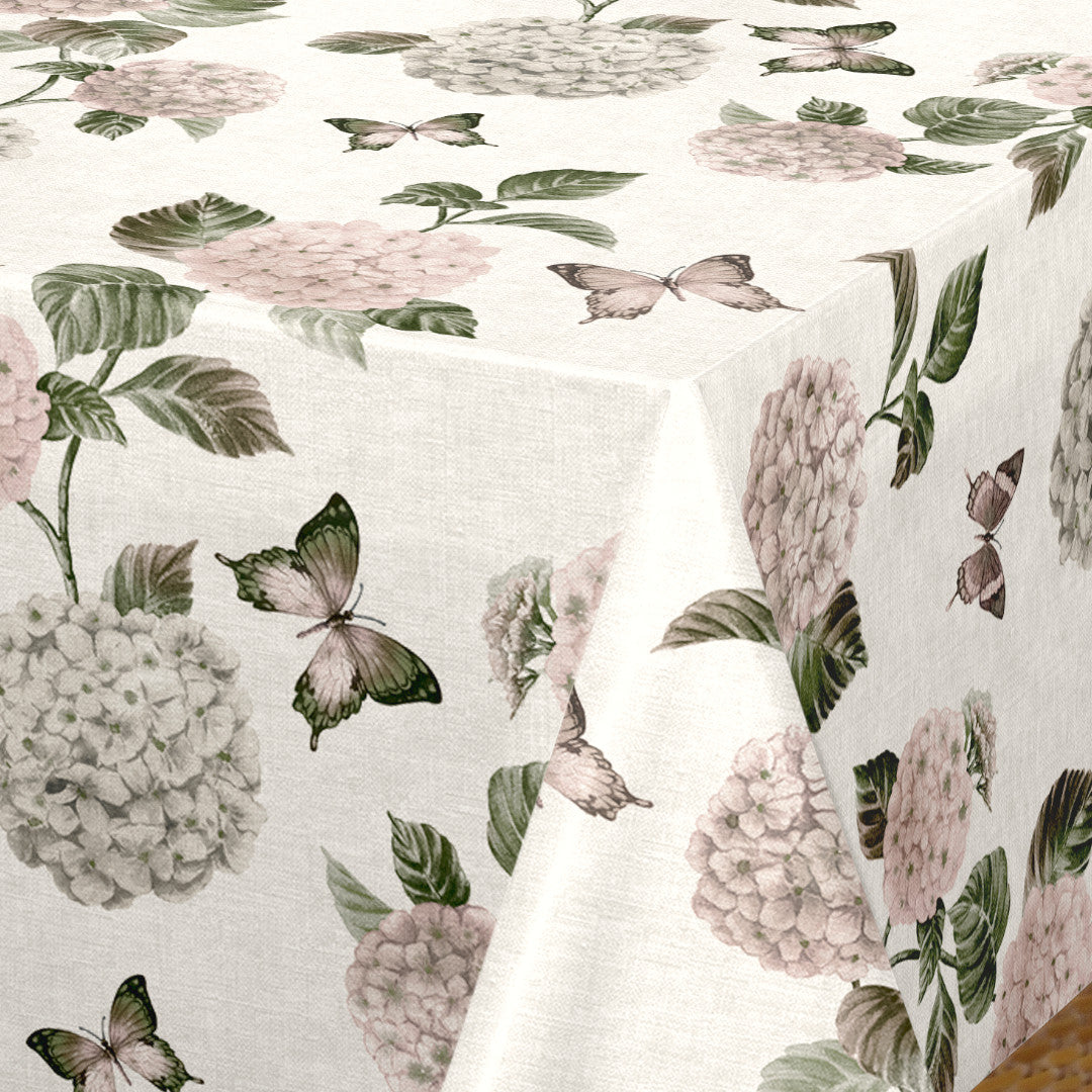 Nordfavn Hortensia Have er en lys og stemningsfuld voksdug med et rigt blomsterprint, hvor fyldige hortensiablomster folder sig ud i bløde nuancer af støvet rosa, sart grøn og afdæmpet grå. Mellem blomsterne ses små sommerfugle, der tilfører mønsteret et let og levende udtryk uden at virke uroligt.