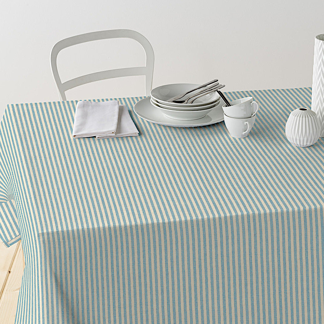 De støvede blå striber løber på tværs af dugen og skaber et roligt, grafisk udtryk på den naturfarvede bund – oplagt til både morgenbordet og afslappede middage. Ibiza passer perfekt ind i en nordisk stil og er samtidig let at holde med sin praktiske, smudsafvisende overflade.