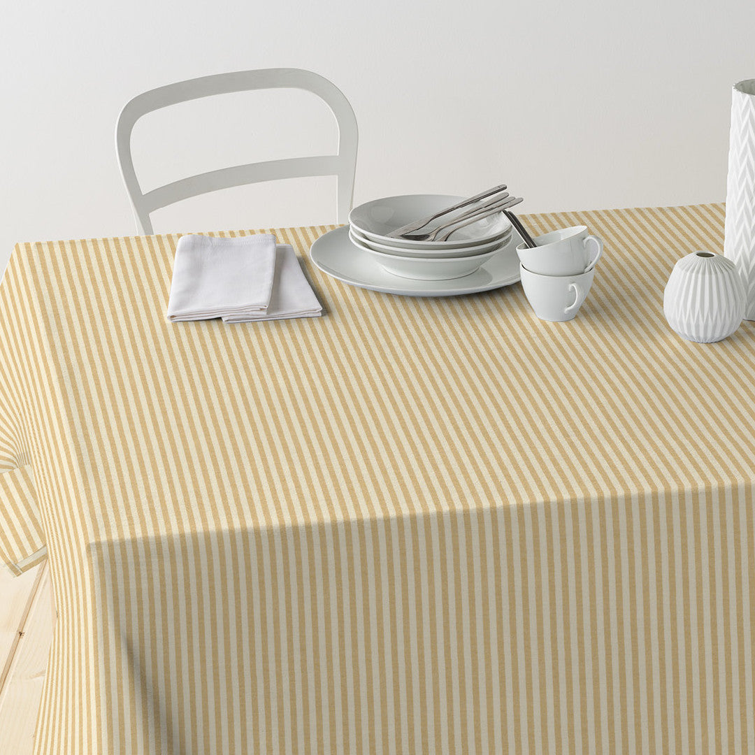 Giv borddækningen et varmt strejf med Ibiza Støvet Okker – en akryldug med tværgående striber i en gylden støvet okker på naturfarvet bund. Den vævede bomuldstekstur med hørlook skaber et roligt, tekstilt udtryk, mens den praktiske akrylbelægning beskytter mod pletter og gør dugen nem at holde ren.