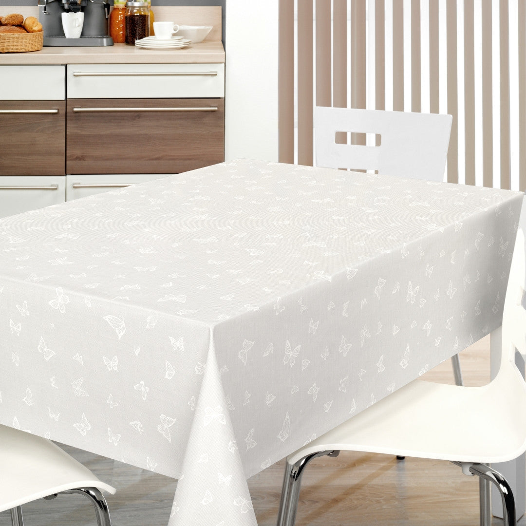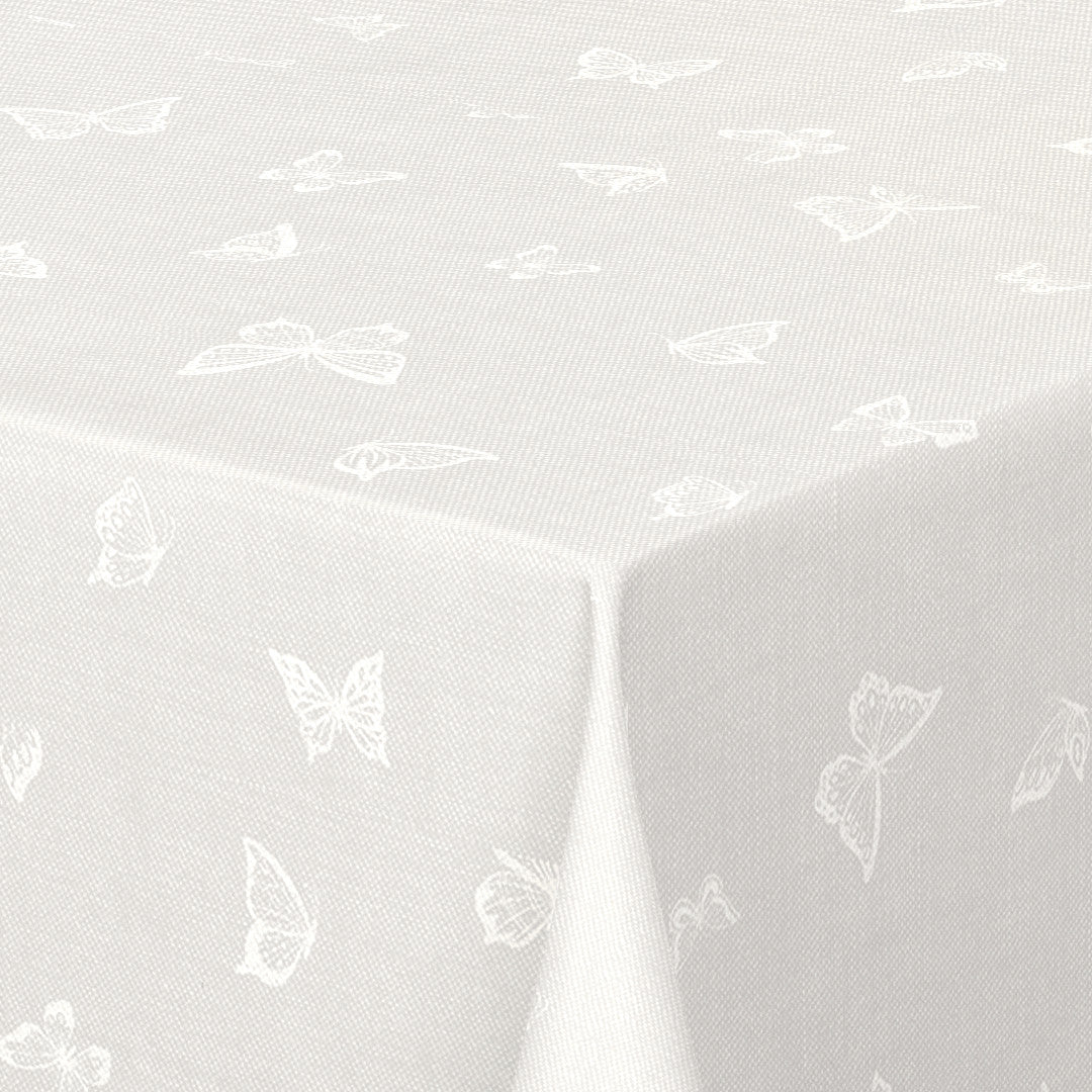 De hvide sommerfugle svæver let hen over den lyse baggrund og skaber en lethed, der klæder både hverdagsbordet og festlige lejligheder. Dugen er fremstillet i en glat overflade uden tekstilstruktur, hvilket gør den særligt nem at rengøre og vedligeholde – ideel til brug i hjemmet såvel som i café, restaurant og institutionsmiljøer, hvor man ønsker både holdbarhed og et stilrent udtryk.