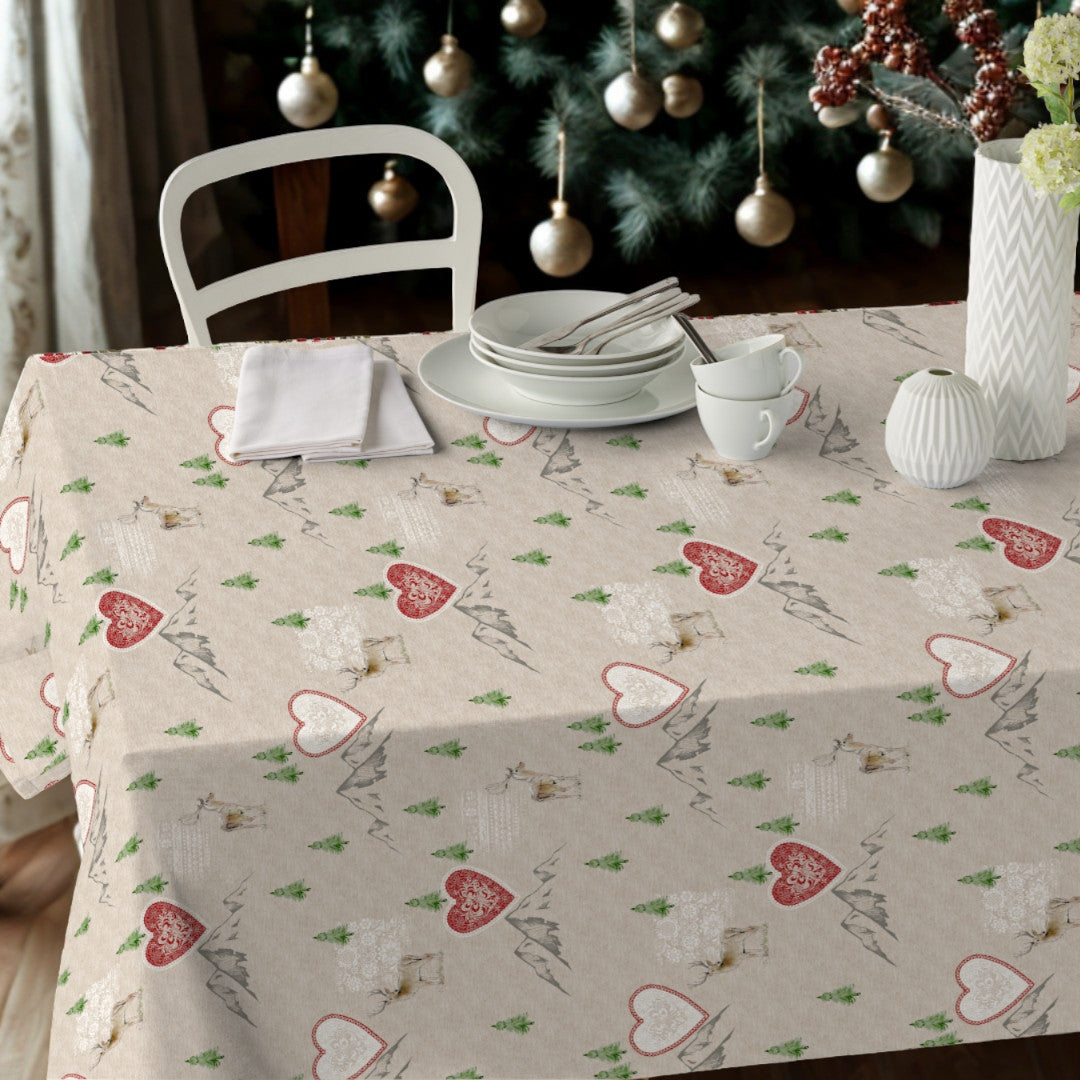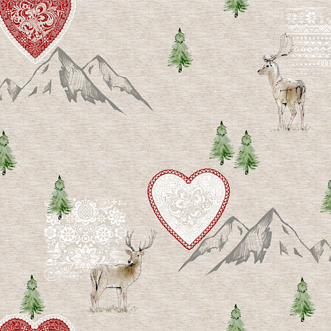 Nordfavn Vixen er en smuk juleakryldug inspireret af nordisk natur og vinterlandskaber. Motivet kombinerer grantræer, bjerge, rensdyr og dekorative hjerter i røde og hvide nuancer – alt sammen på en varm, naturlig bund. Dugen bringer en stemning af vinterhygge og ro, som passer perfekt til både jul og vinterens hyggelige sammenkomster.