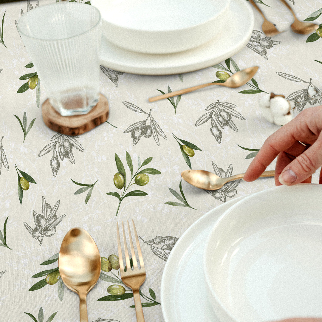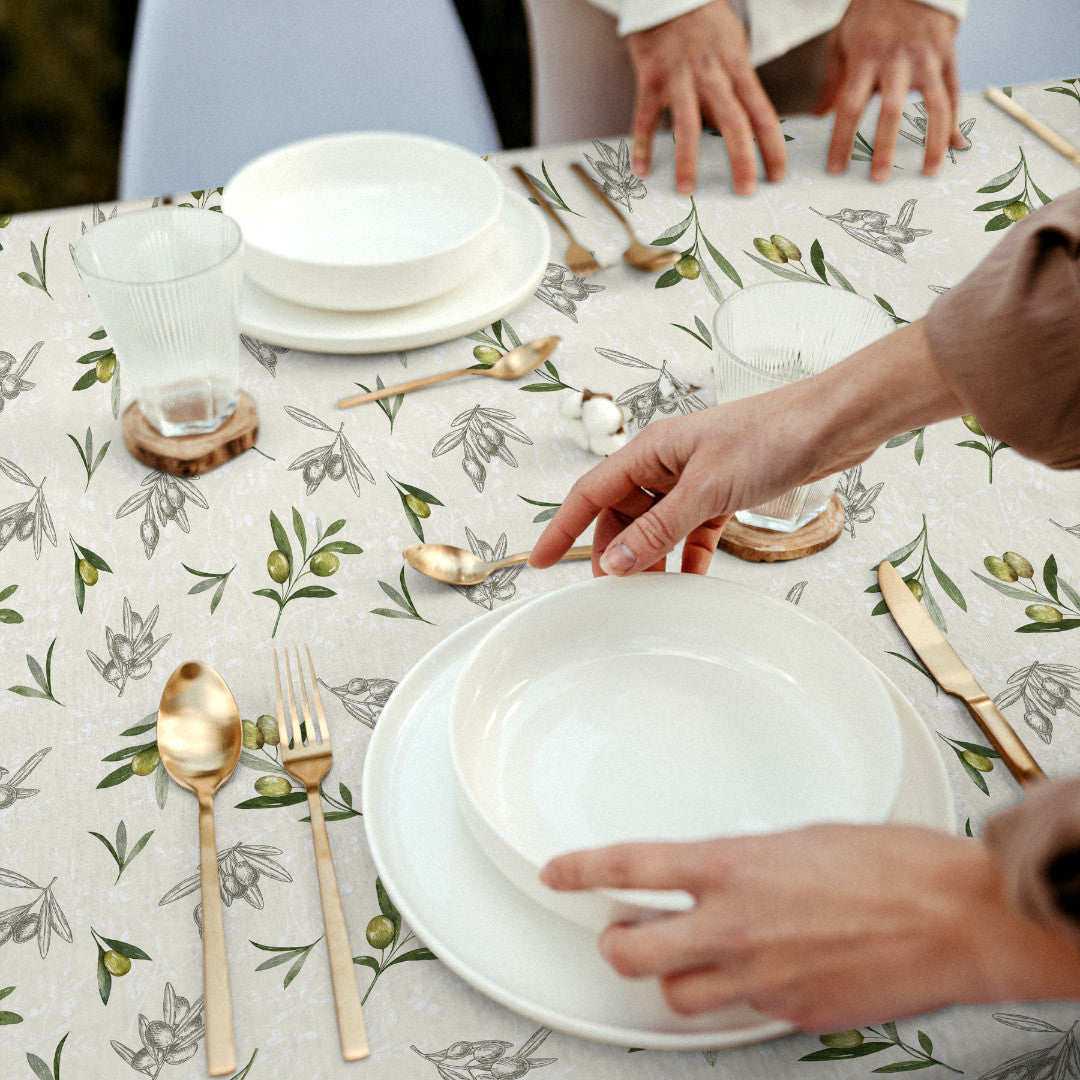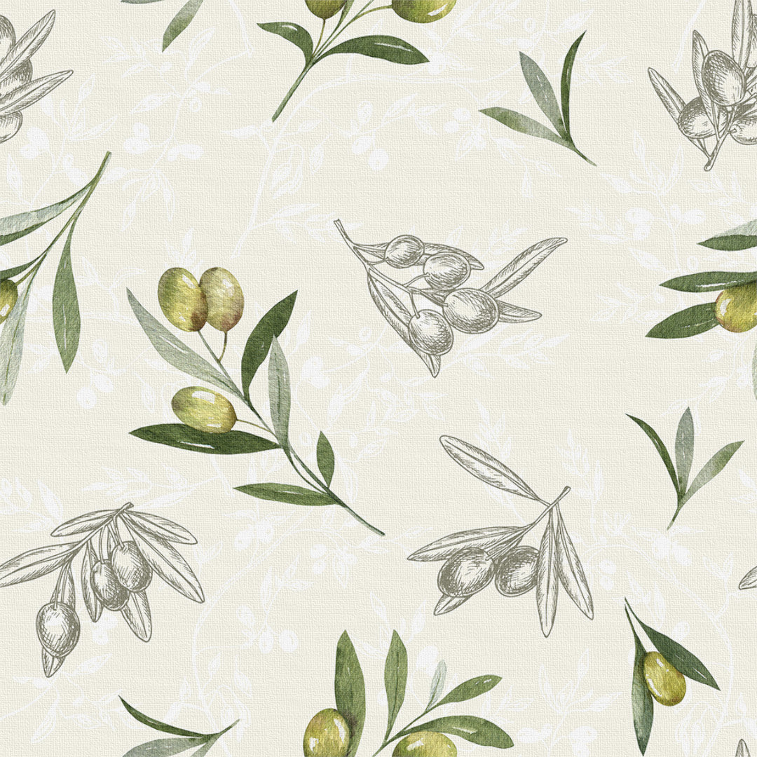 En charmerende akryldug med akvareltegnede olivengrene i naturlige grønne toner, kombineret med fine stregtegninger i grå. Det hele ligger på en blød offwhite bund, hvor der i baggrunden anes et let mønster, der giver dugen karakter og dybde. Udtrykket er en blanding af klassisk landlighed og let vintage-stemning – ideel både til hverdagsbordet og lange sommeraftener.