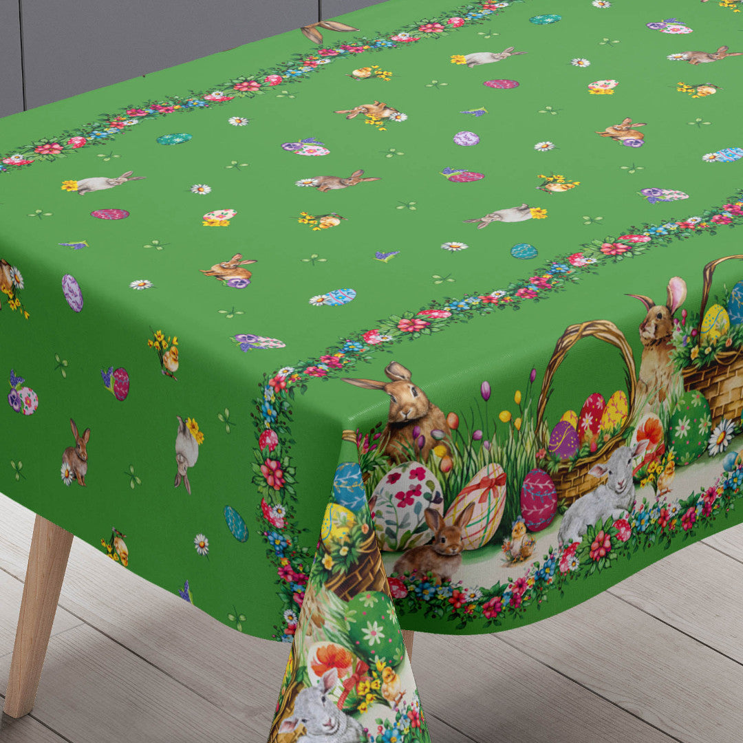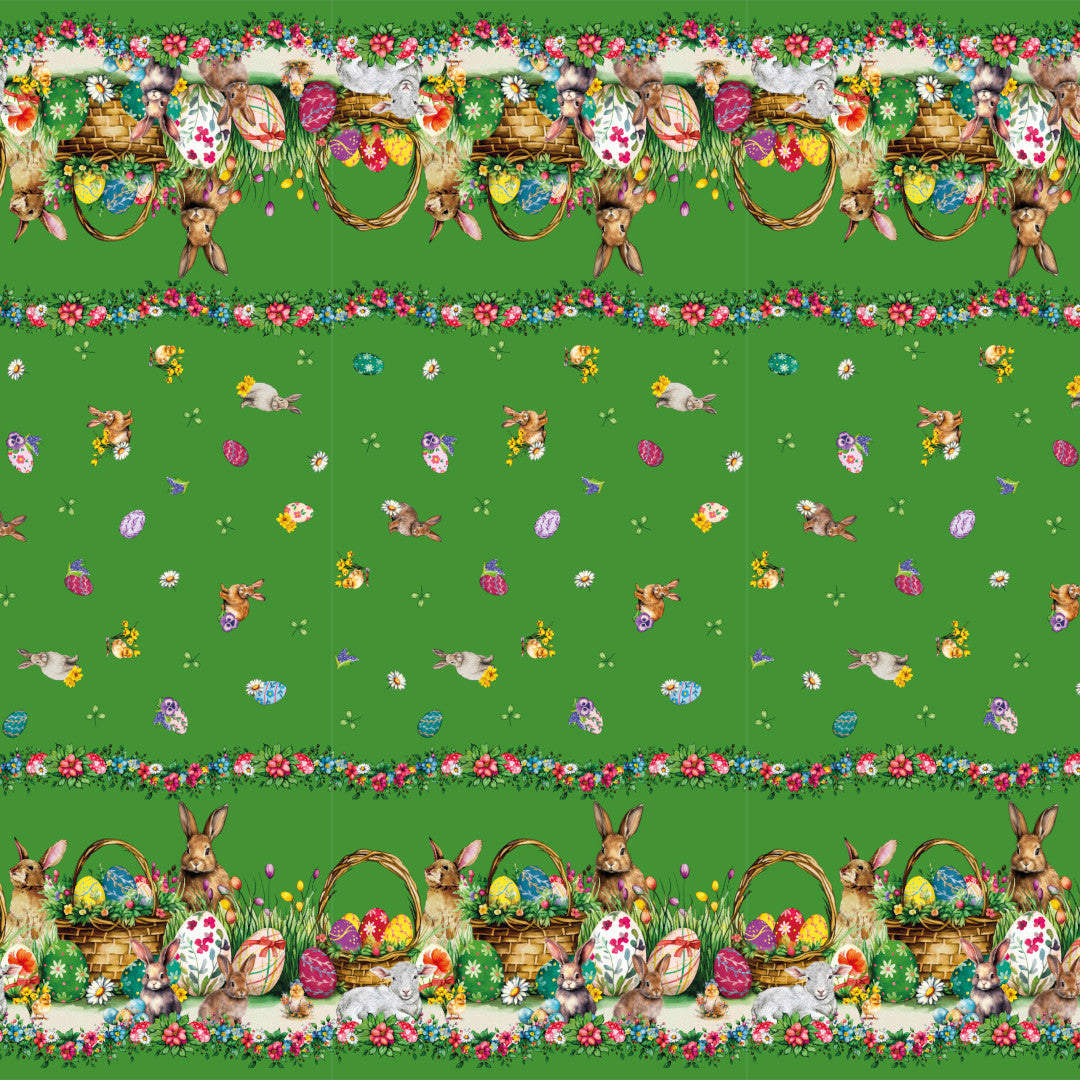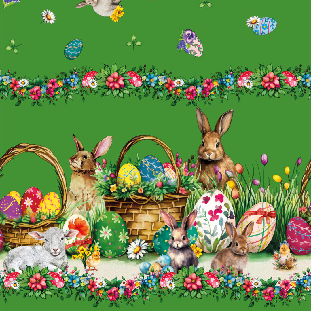 Påskelam Grøn har en frisk, klar grøn bund, der leder tankerne hen på spirende græs og forårets første solrige dage. Den dekorative kant med lam, påskeharer, blomster og farverige æg skaber en levende indramning, mens de små motiver i midten giver dugen et let og legende udtryk.