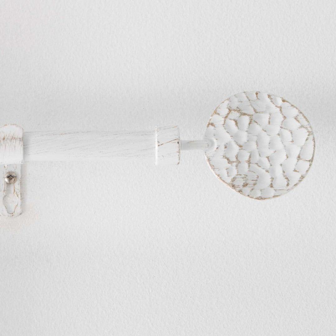 Patina Bullette gardinstangen i hvid og guld giver et lyst og elegant udtryk til dine vinduer. De runde endestykker med let krakeleret struktur tilfører et charmerende, antikt præg, mens den gyldne patinering skaber en varm og indbydende glød.