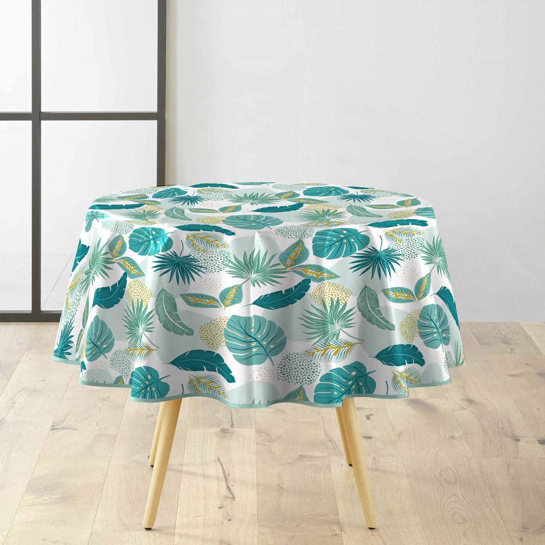 Plantania Blå er en rund voksdug med et friskt og moderne botanisk design. De smukke blade i blå- og grønne nuancer skaber et let tropisk udtryk, der giver liv og farve til bordet uden at virke dominerende.