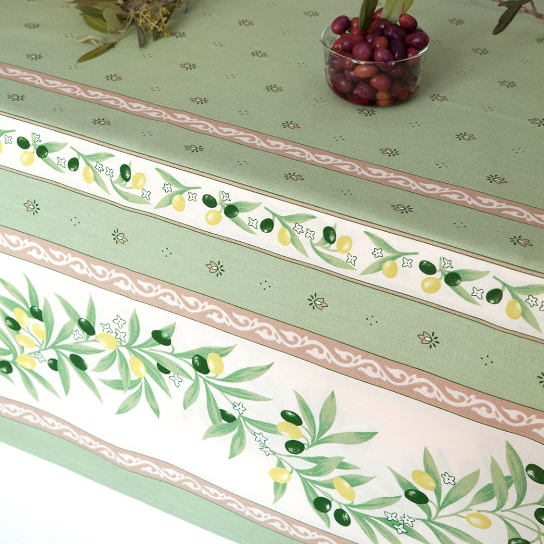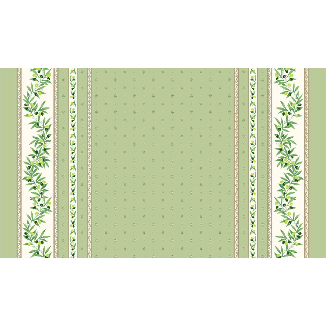 Ramatuelle Grøn er en klassisk fransk provencedug i 100% bomuld med akrylbelægning. Farverne er bløde og rolige – grøn, creme og sand – med olivengrene i forskellige nuancer og små blomster fordelt over midten og kanterne.