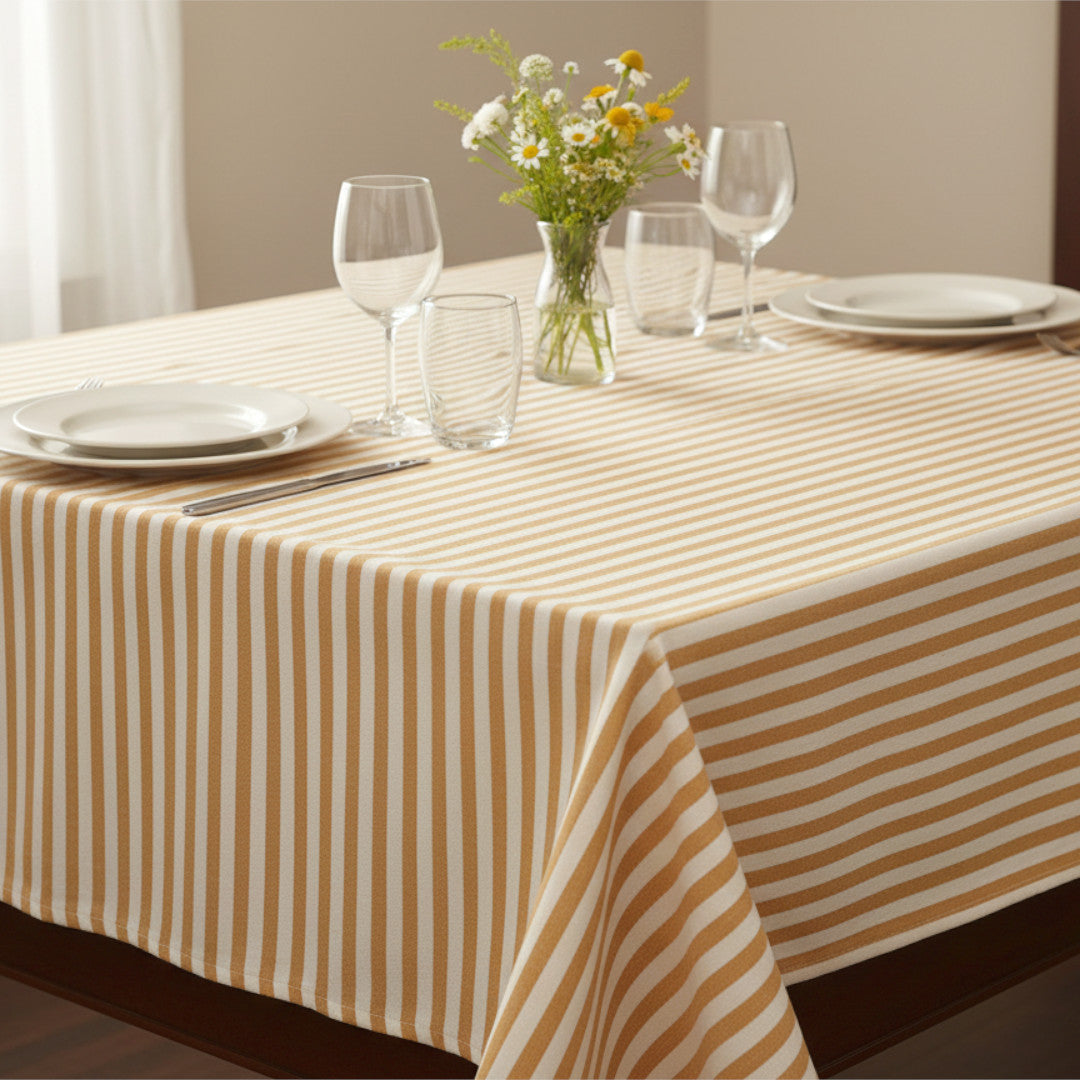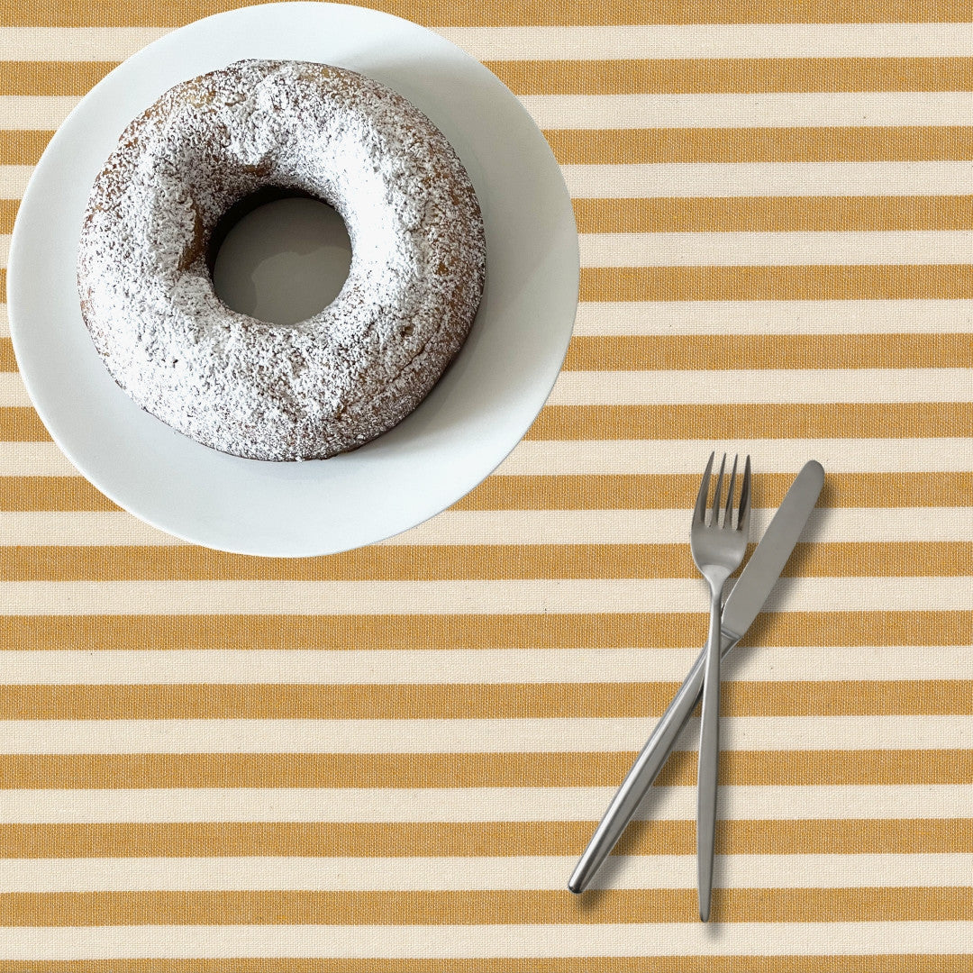 Sennepsgul Nordisk Strib kombinerer klassiske striber med en dæmpet sennepsgul nuance, der giver bordet varme og karakter. Den gyldne tone står smukt mod den lyse bund og giver et roligt, nordisk udtryk, som passer både til moderne hjem og mere landlige omgivelser.