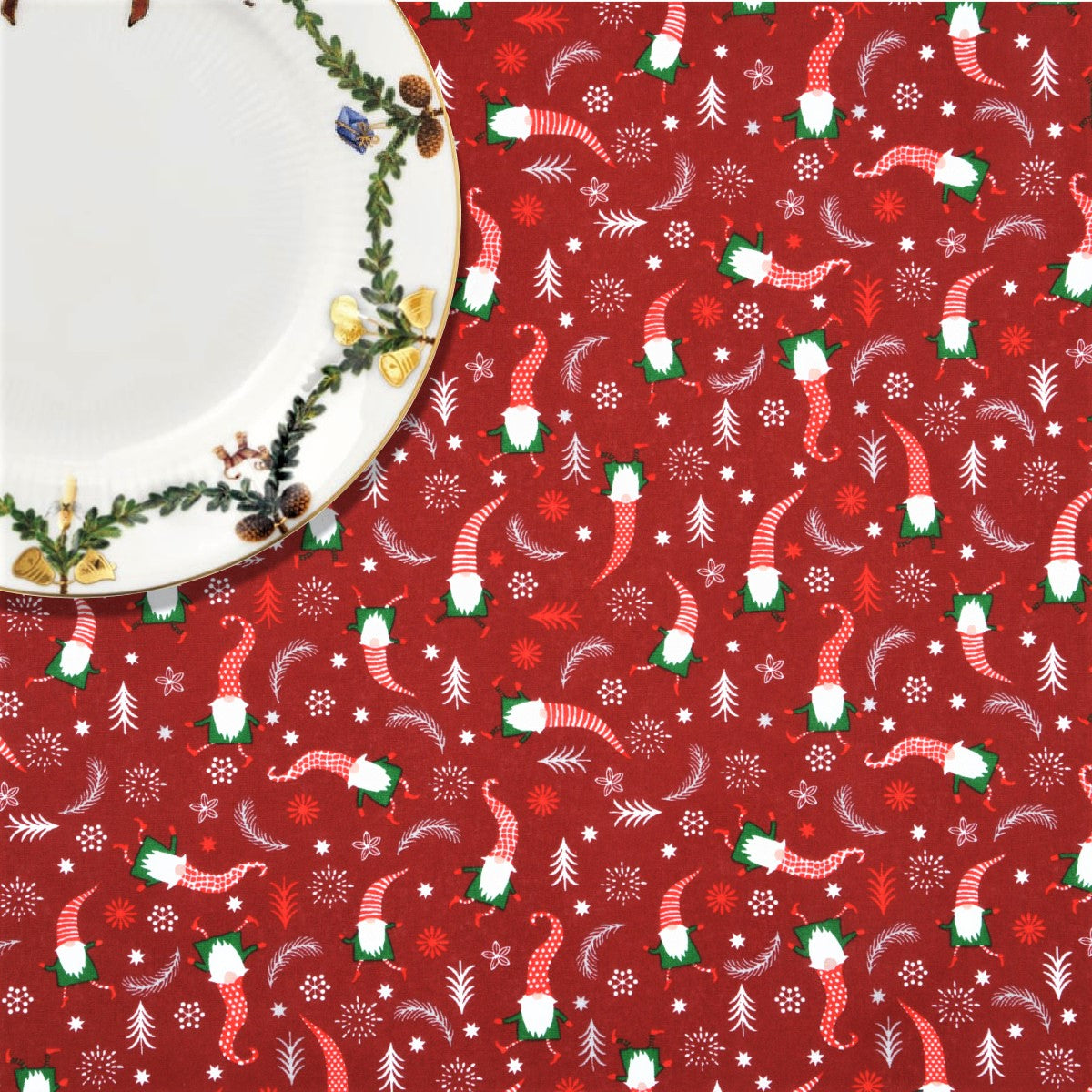 Skovnisser Rød - Juleakryldug med nisser, gran og stjerner
