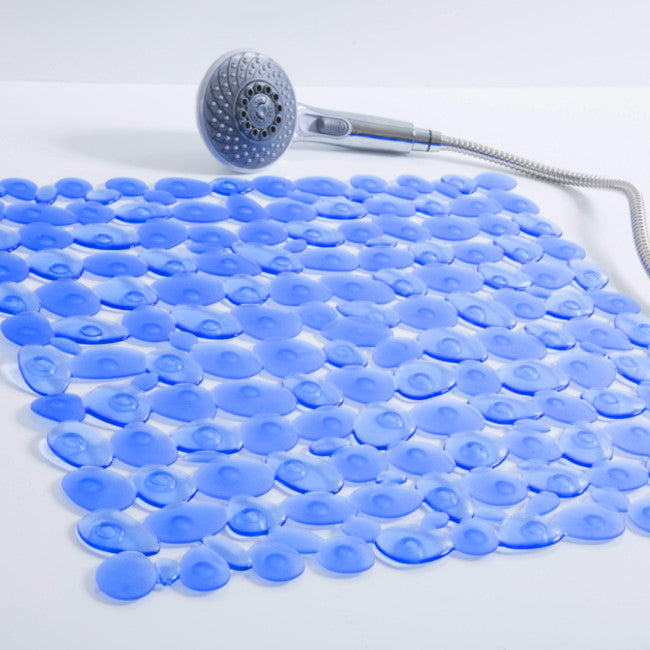 Riverstone-bademåtten i lys blå giver et sikkert fodfæste i badet med de mange sugekopper på bagsiden. Overfladen er inspireret af glatte småsten og danner et dekorativt mønster, som samtidig lader vandet løbe frit igennem.