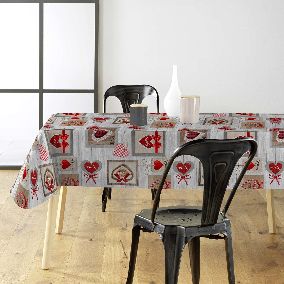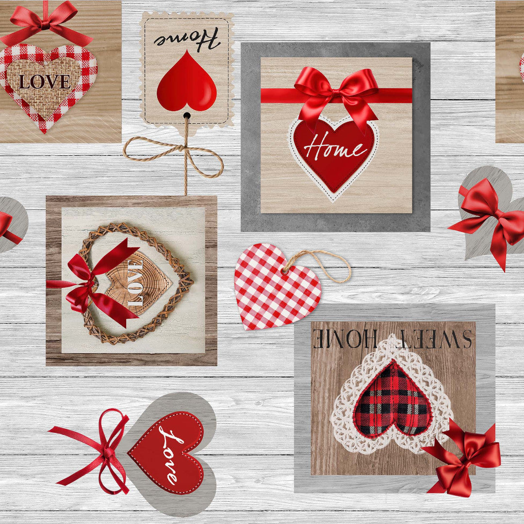 Vil du skabe en varm og hyggelig stemning omkring bordet? Så er Sweet Love voksdugen lige noget for dig. Dugen har et charmerende motiv med røde og ternede hjerter, sløjfer, træteksturer og små budskaber som “Love”, “Home” og “Sweet Home” – alt sammen sat op som små tavler og skiltelignende detaljer i patchwork-stil.