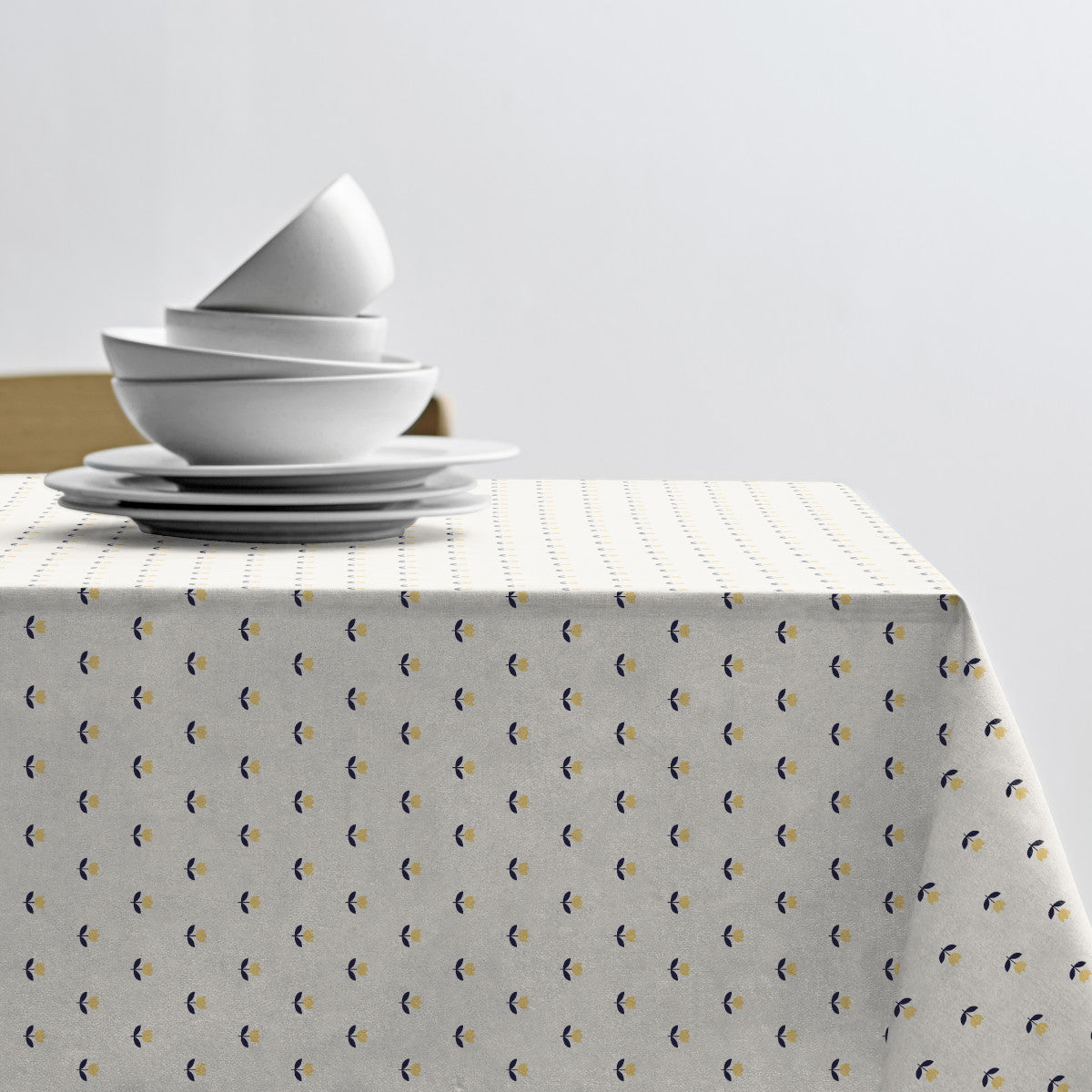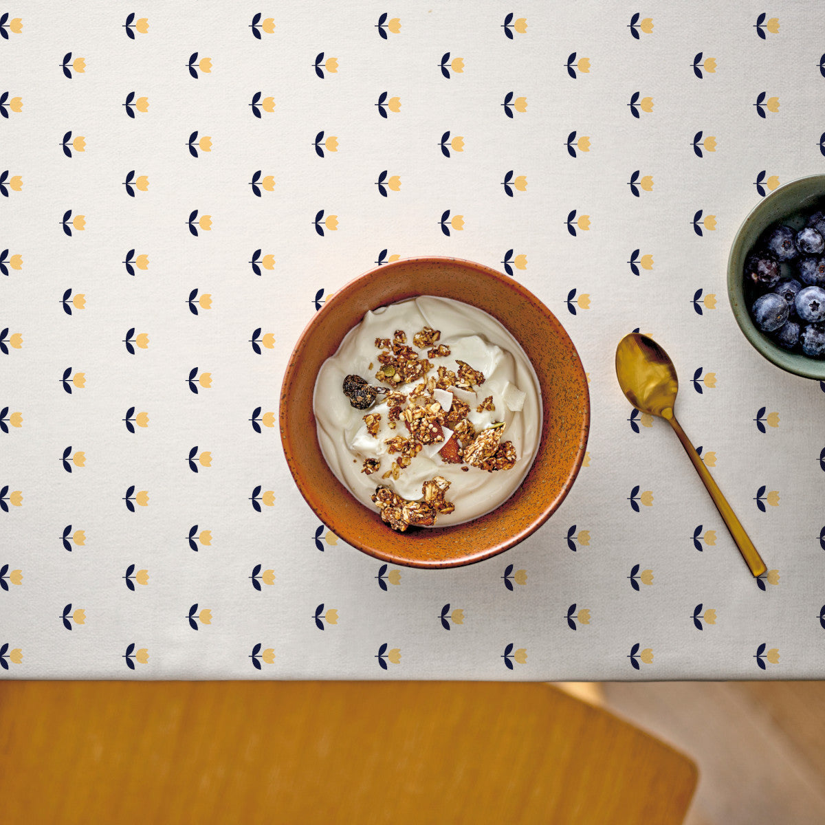 Tulipanernes rytmiske mønster tilfører en nordisk enkelhed, mens akryloverfladen gør dugen nem at vedligeholde og praktisk til daglig brug.