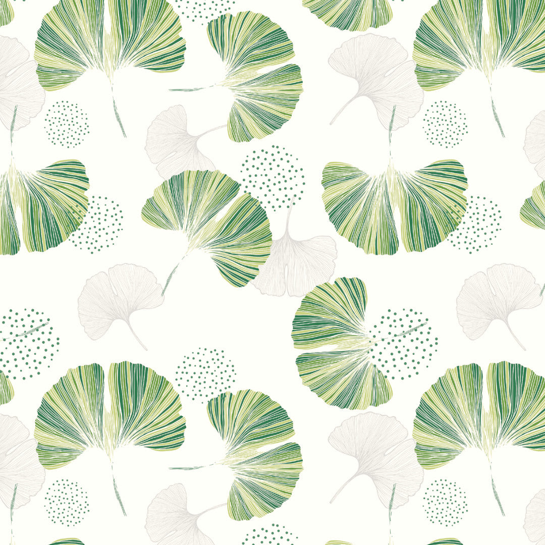 En livlig og alligevel afbalanceret akryldug med et grafisk bladmotiv i grønne nuancer på en offwhite bund. De smukke, stiliserede blade minder om ginkgo eller palmeblade og er udført med fine linjer og lette prikmønstre, der giver dugen et let og nutidigt udtryk.