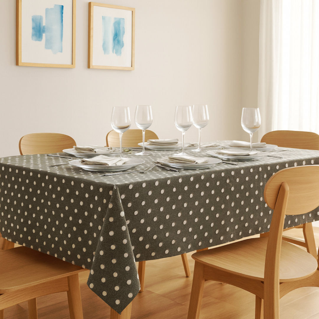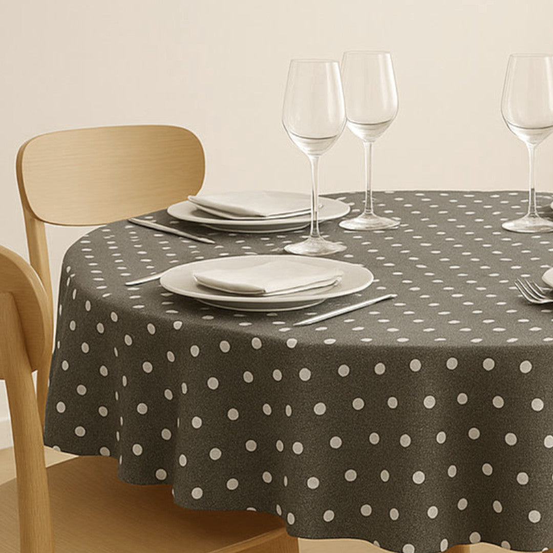 Et klassisk prikket mønster i hvid på mørk støvet grå bund giver dugen et harmonisk og afbalanceret udtryk. Farvespillet er roligt og klæder både lyst og mørkt træ.