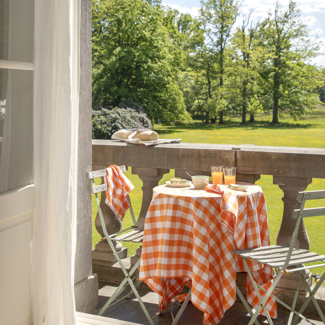 WOW Spring Apricot i størrelsen 150 x 150 cm er en klassisk ternet bomuldsdug i en varm abrikosfarvet nuance kombineret med hvid. De bløde tern giver bordet et let og indbydende udtryk med tydelig reference til forår og sommer.